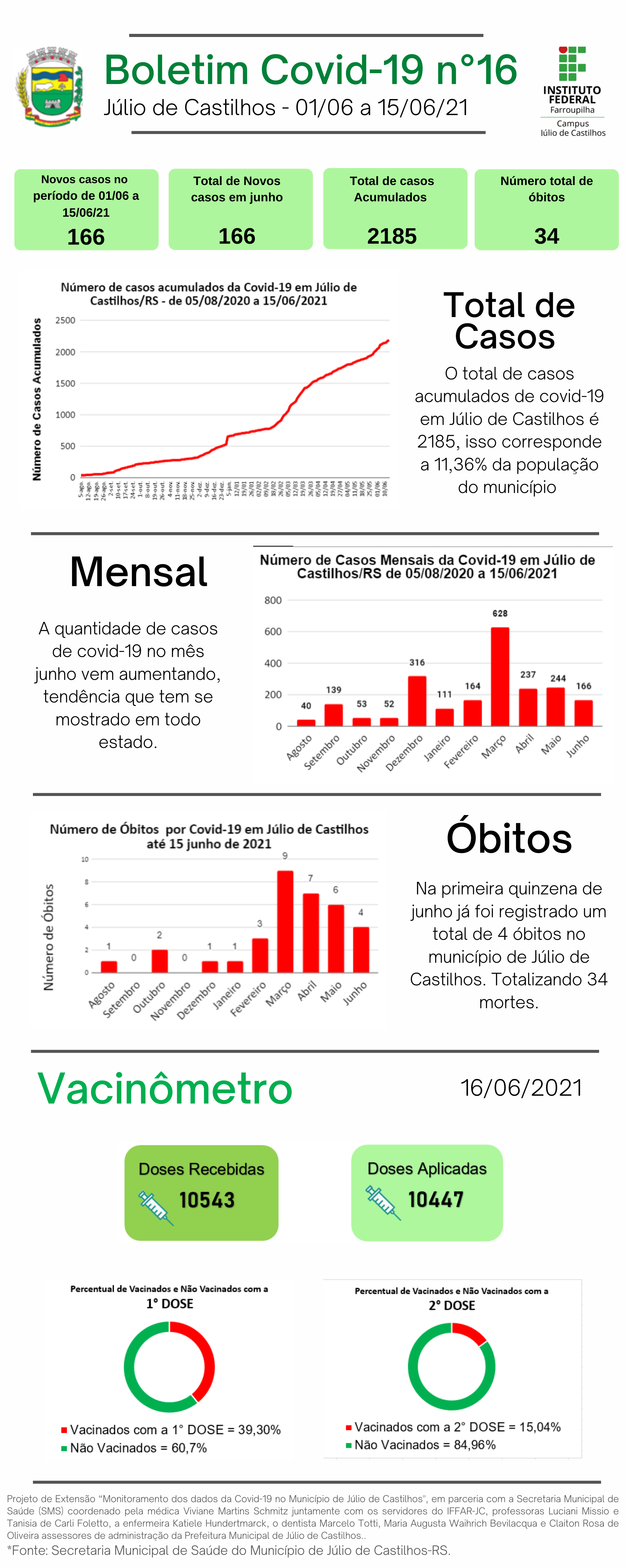 O Instituto Federal Farroupilha Campus Júlio de Castilhos (IFFar-JC), por meio do Projeto de Extensão “Monitoramento dos dados da Covid-19 no município de Júlio de Castilhos", em parceria com a Secretaria Municipal de Saúde (SMS) apresenta os dados sobre a infecção pelo novo coronavírus no município no 16º Relatório Epidemiológico. Este conta com o "Vacinômetro", que destaca o acompanhamento da vacinação contra a Covid-19 em Júlio de Castilhos.