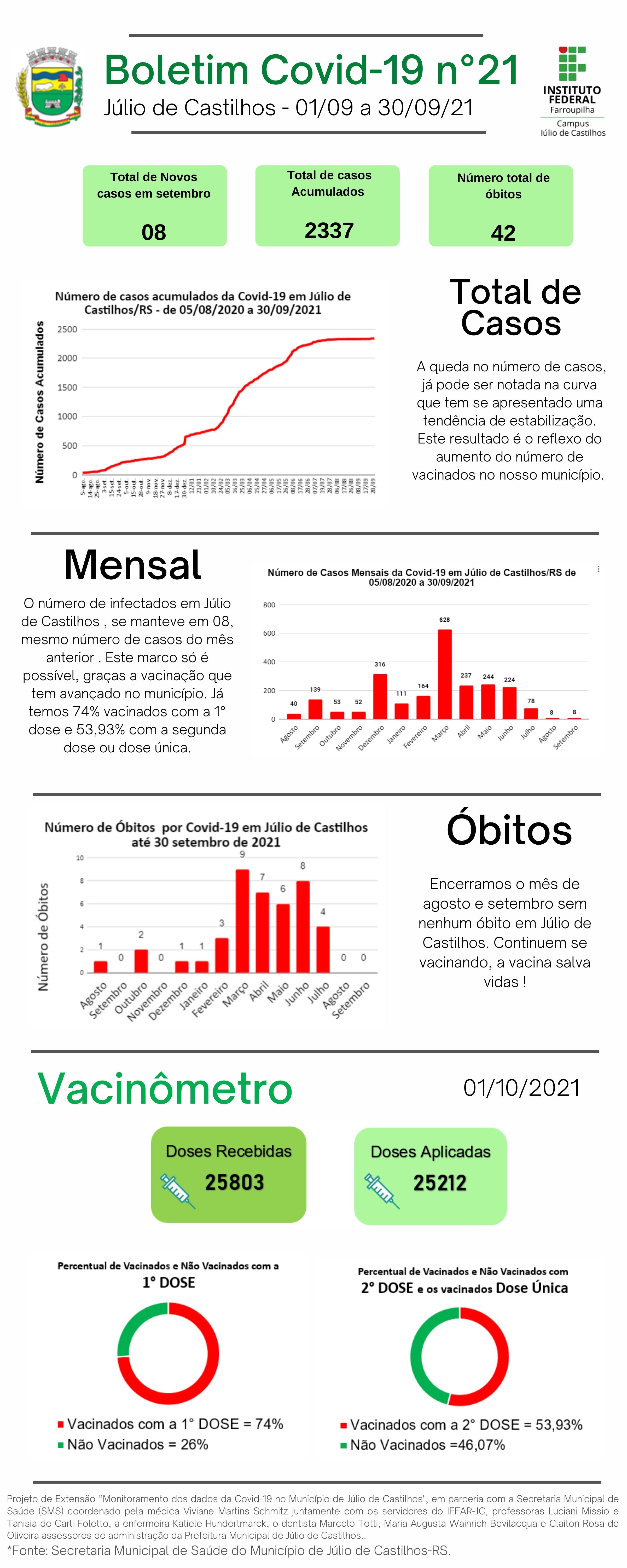 O Instituto Federal Farroupilha Campus Júlio de Castilhos (IFFar-JC), por meio do Projeto de Extensão “Monitoramento dos dados da Covid-19 no município de Júlio de Castilhos", em parceria com a Secretaria Municipal de Saúde (SMS) apresenta os dados sobre a infecção pelo novo coronavírus no município no 21º Relatório Epidemiológico. Este conta com o "Vacinômetro", que destaca o acompanhamento da vacinação contra a Covid-19 em Júlio de Castilhos.