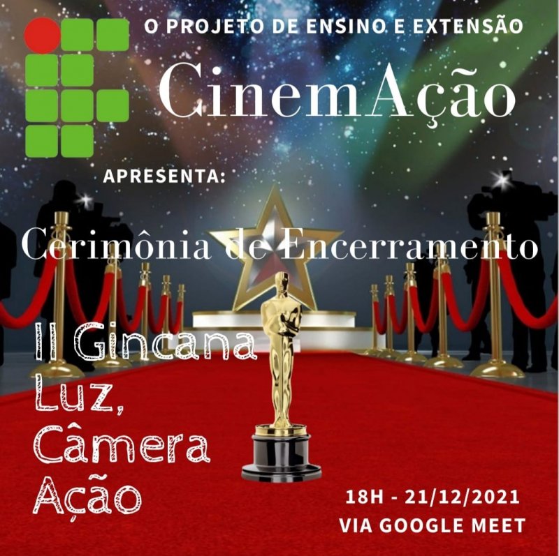 Com imensa alegria convidamos para a Cerimônia de Encerramento do Projeto de Ensino e extensão CinemAção e II Gincana Luz, Câmera, Ação.