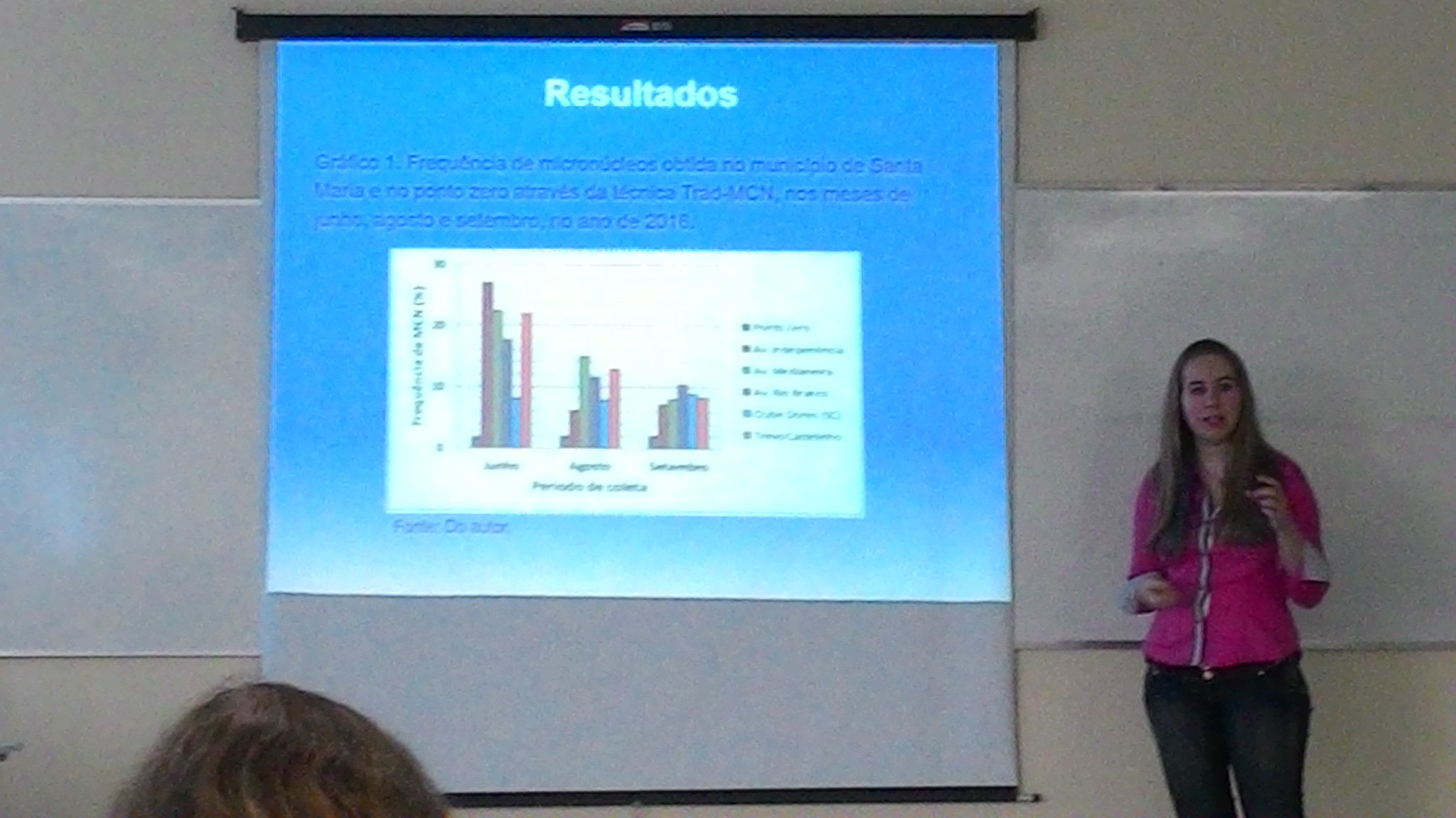 No dia 21 de outubro de 2016, a aluna Verônica A. Hartmann (Licenciatura em Ciências Biológicas), esteve em Santa Maria participando do 31º Salão de Iniciação Científica (XXXI JAI/UFSM) e apresentando o trabalho “Tradescantia pallida purpurea COMO BIOINDICADOR VEGETAL PARA MONITORAR A POLUIÇÃO ATMOSFÉRICA NO MUNICÍPIO DE SANTA MARIA”. Os dados obtidos até o momento estão disponibilizando informações reais relacionadas à qualidade do ar na cidade de Santa Maria, sendo que a avaliação ambiental proposta é relevante devido à inexistência de estudos dessa natureza na região.