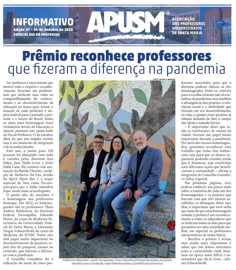 No último sábado (15) foi celebrado o Dia do Professor em um Jantar Baile na APUSM. No evento, três professores foram homenageados pelo seus projetos que fizeram a diferença durante a pandemia. Conheça um pouco mais desses professores:
