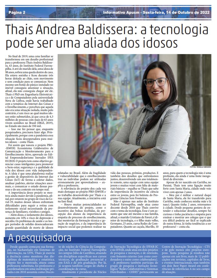 Thais Andrea Baldissera, PhD em Engenharia Eletrotécnica e de Computadores pela Universidade Nova de Lisboa e professora do Instituto Federal Farroupilha Campus Júlio de Castilhos, criou o projeto "PROID@DE: Ecossistema Colaborativo de Comunicação e Monitoramento para o Envelhecimento Ativo". O projeto tem como objetivo gerenciar casas inteligentes para promover o bem-estar, segurança e a qualidade de vida dos idosos com vida independente. A ideia é que uma plataforma realize a gestão de dispositivos da Internet das Coisas de forma a coletar dados, analisar padrões, alertar situações anormais, e comunicar o estado dessas pessoas e do seu contexto em tempo real.