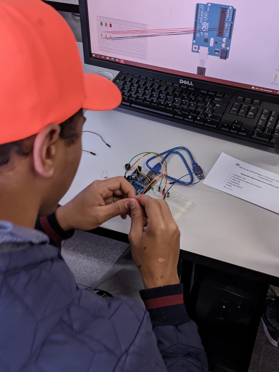 Durante as oficinas foram trabalhados conceitos de ambiente virtual, pensamento computacional, programação em Scratch e Arduino, sendo possível o desenvolvimento da aprendizagem maker, a partir da construção de projetos interativos, trabalhando com a simulação e a montagem física de protótipos. Todos os estudantes ganharam kits com pastas e canetas e instruções de acesso ao Ambiente Virtual às oficinas. As oficinas tiveram uma abordagem híbrida e gamificada, com estações de simulação e mão na massa, realizados de forma alternada nas escolas e no IFFar. Ao final das atividades, um quiz sobre os conceitos abordados nas oficinas era realizado, premiando com brindes os estudantes mais bem pontuados.