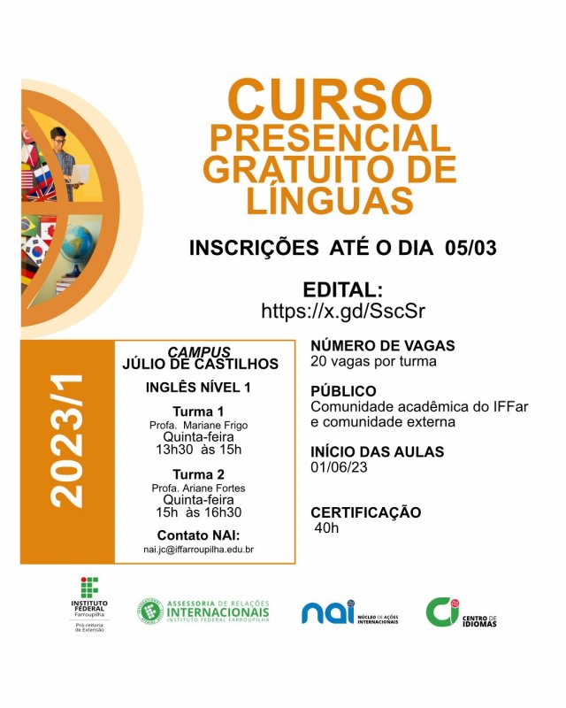 O Instituto Federal Farroupilha Campus Júlio de Castilhos abriu inscrições para cursos gratuitos presenciais de Inglês básico. As inscrições vão até 5 de março. Podem participar alunos e servidores do IFFar e comunidade externa.