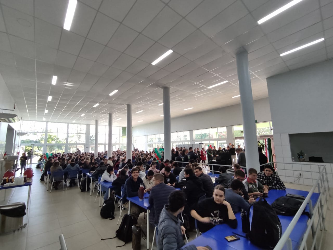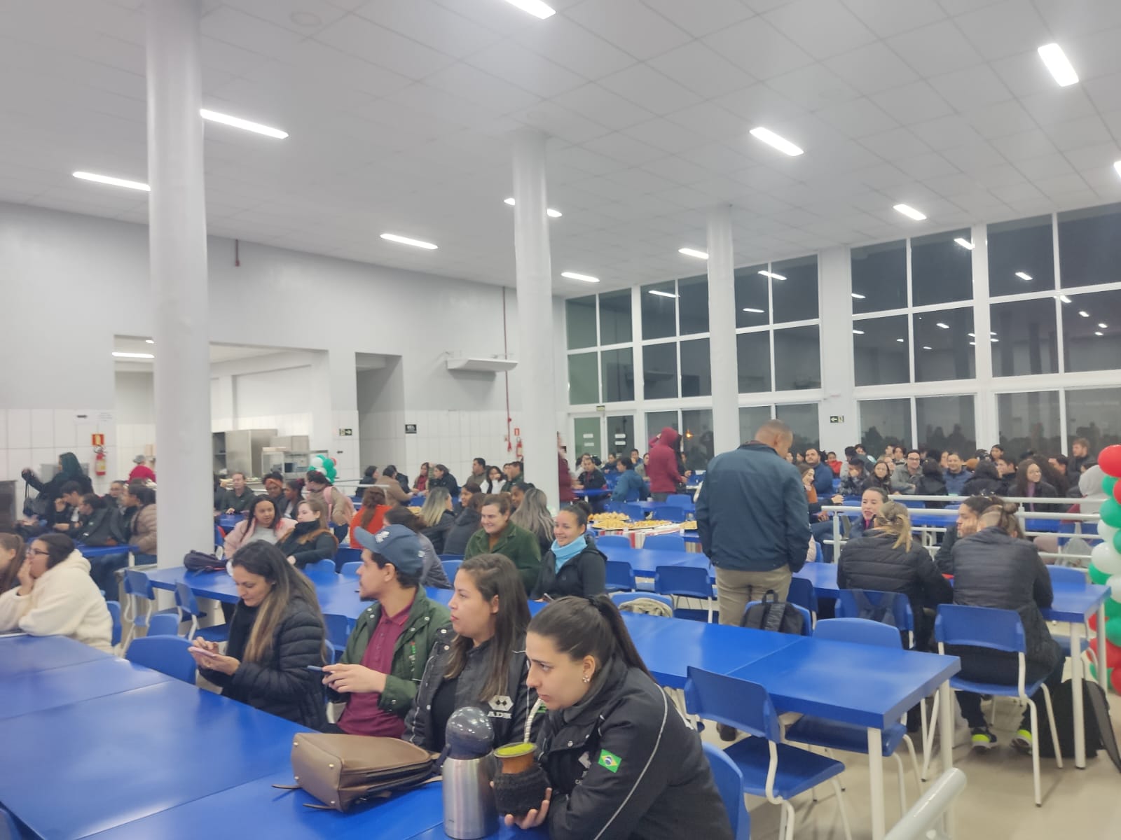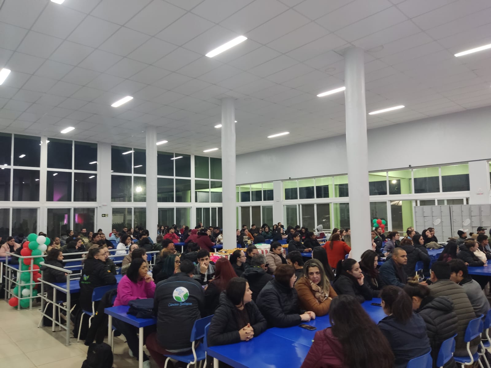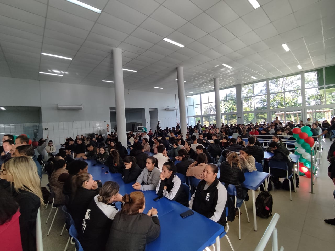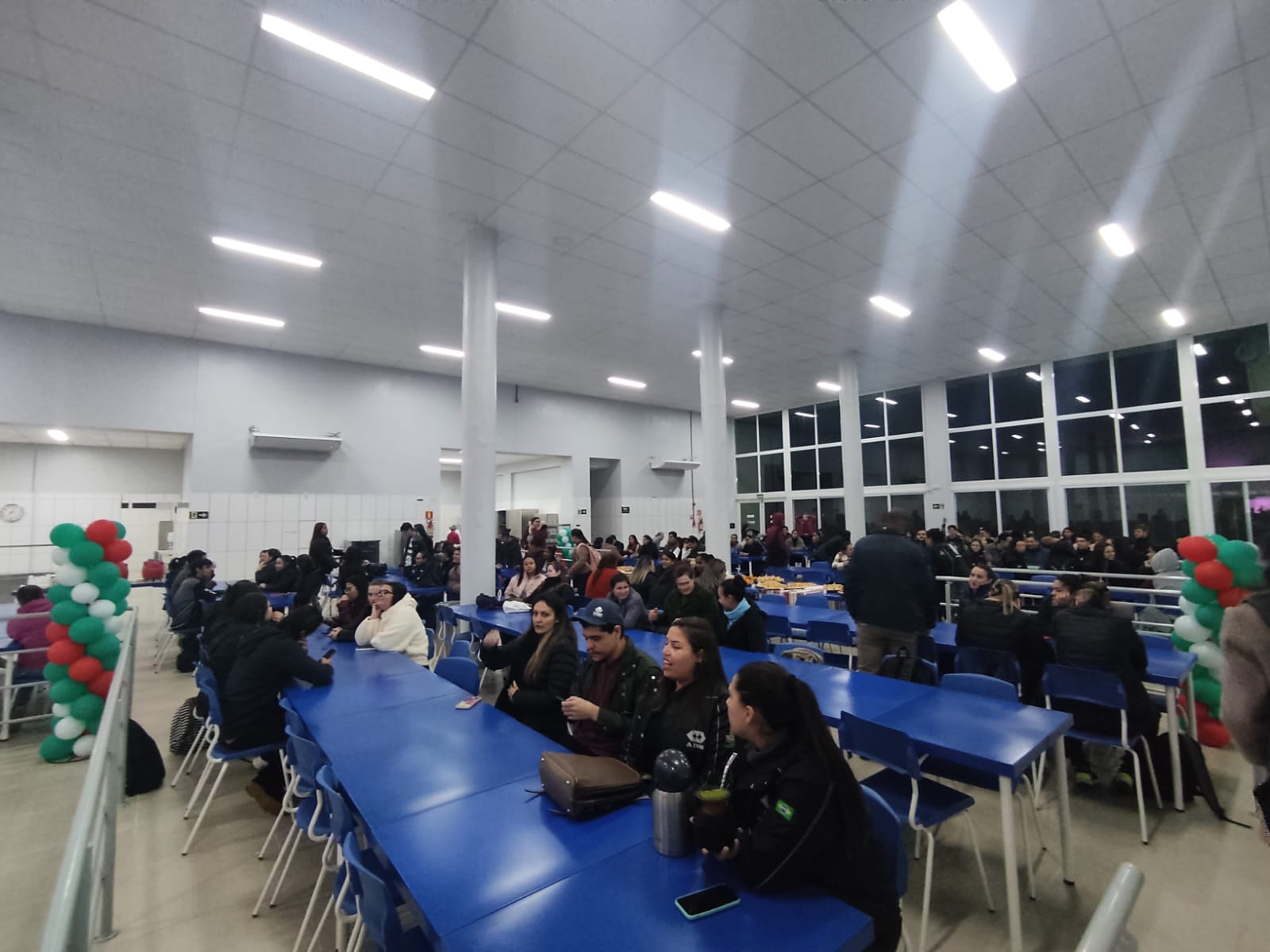 Os/as alunos/as da noite também foram recebidos no novo refeitório. Teve uma pequena fala do diretor Rodrigo Carlotto que discorreu sobre a história do campus e a importância de cada estudante para a instituição. Após teve música ao vivo com o professor Ale, o servidor Ciro Adilson Atzler e o estudante Felipe Braz (2° ano do Técnico Integrado em Agropecuária) e o lanche coletivo.