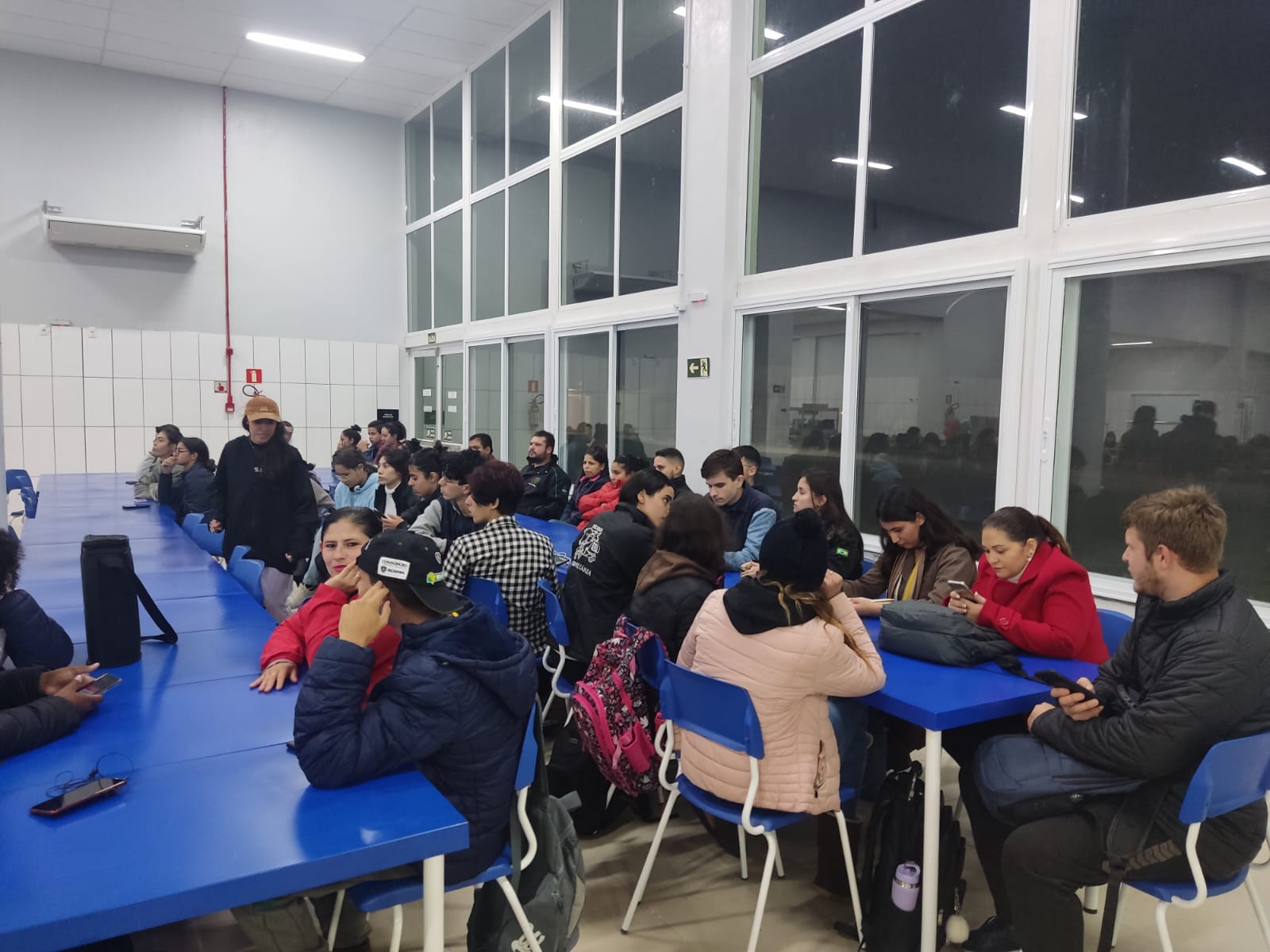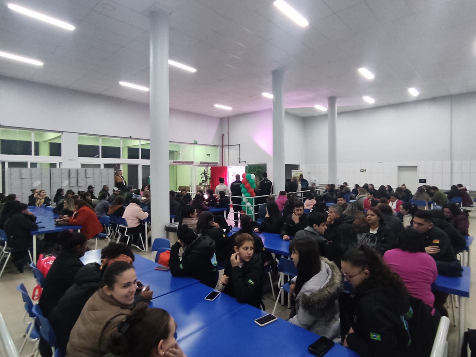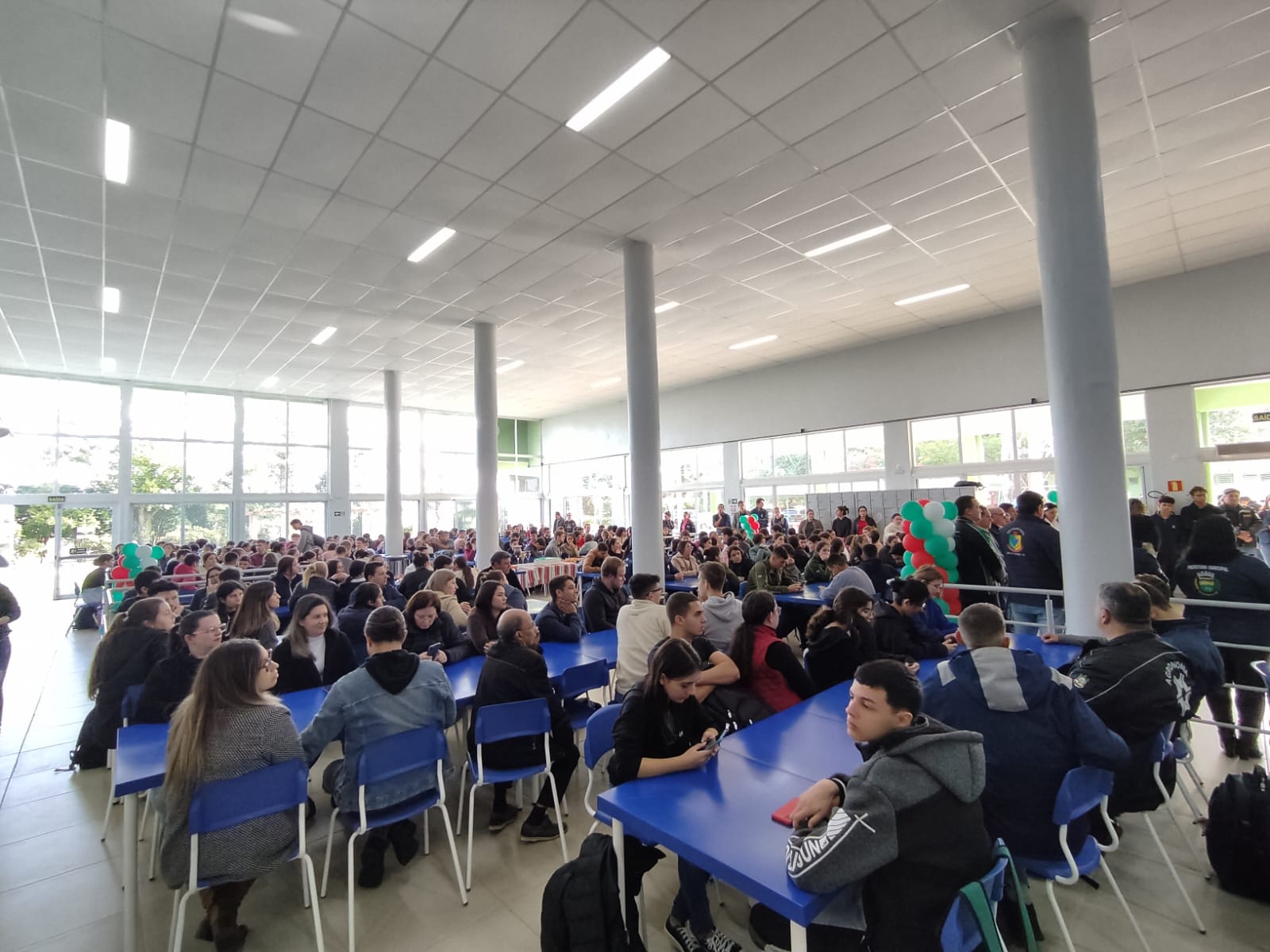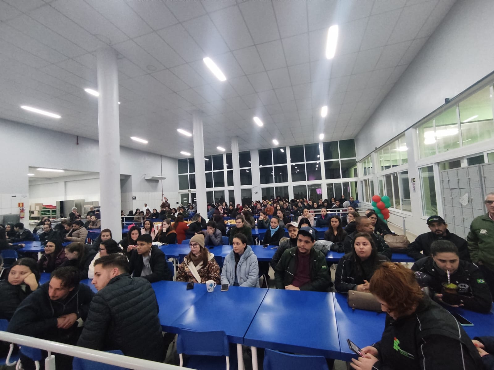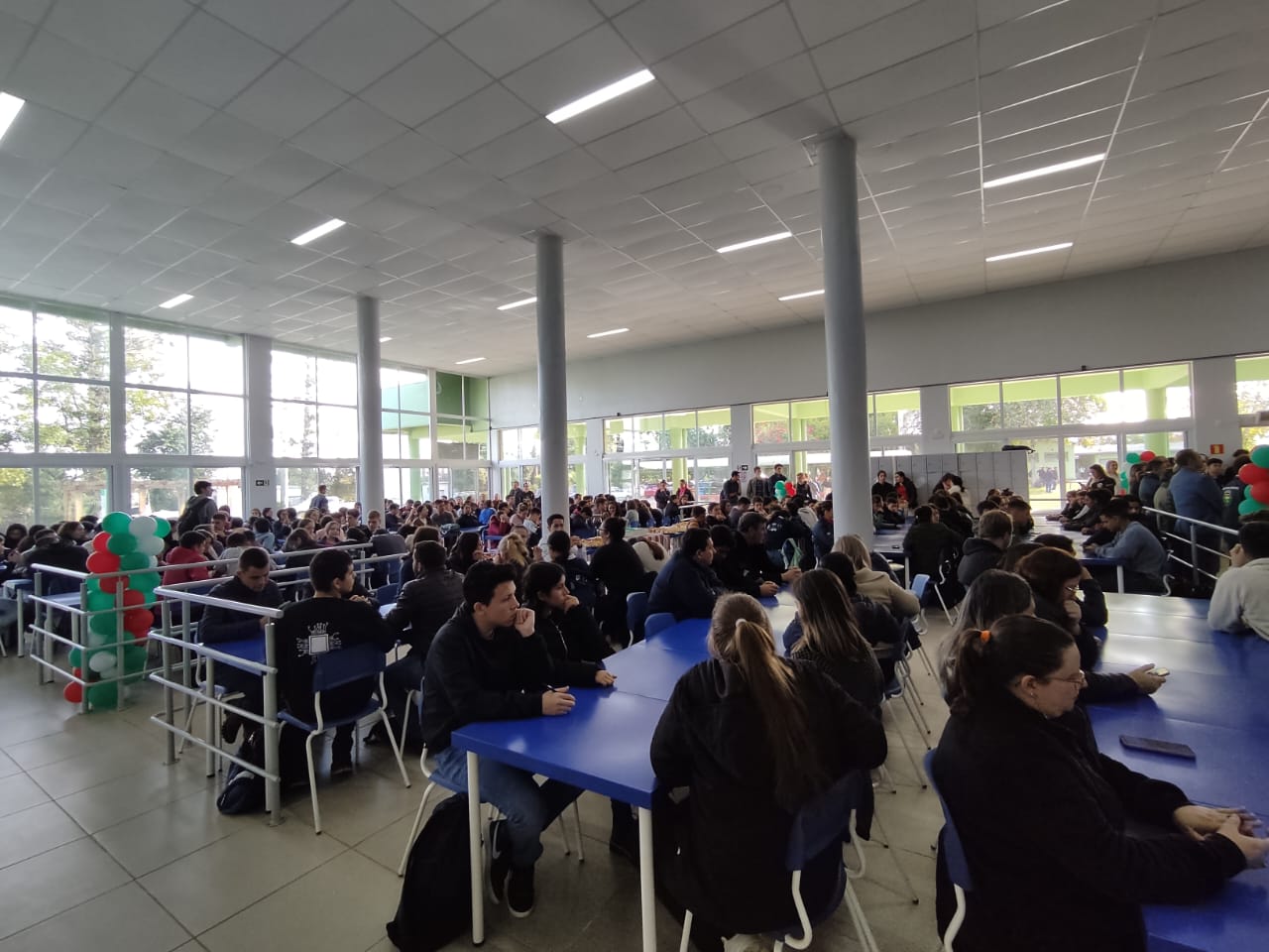 Os/as alunos/as da noite também foram recebidos no novo refeitório. Teve uma pequena fala do diretor Rodrigo Carlotto que discorreu sobre a história do campus e a importância de cada estudante para a instituição. Após teve música ao vivo com o professor Ale, o servidor Ciro Adilson Atzler e o estudante Felipe Braz (2° ano do Técnico Integrado em Agropecuária) e o lanche coletivo.