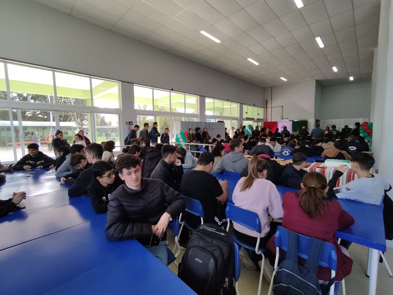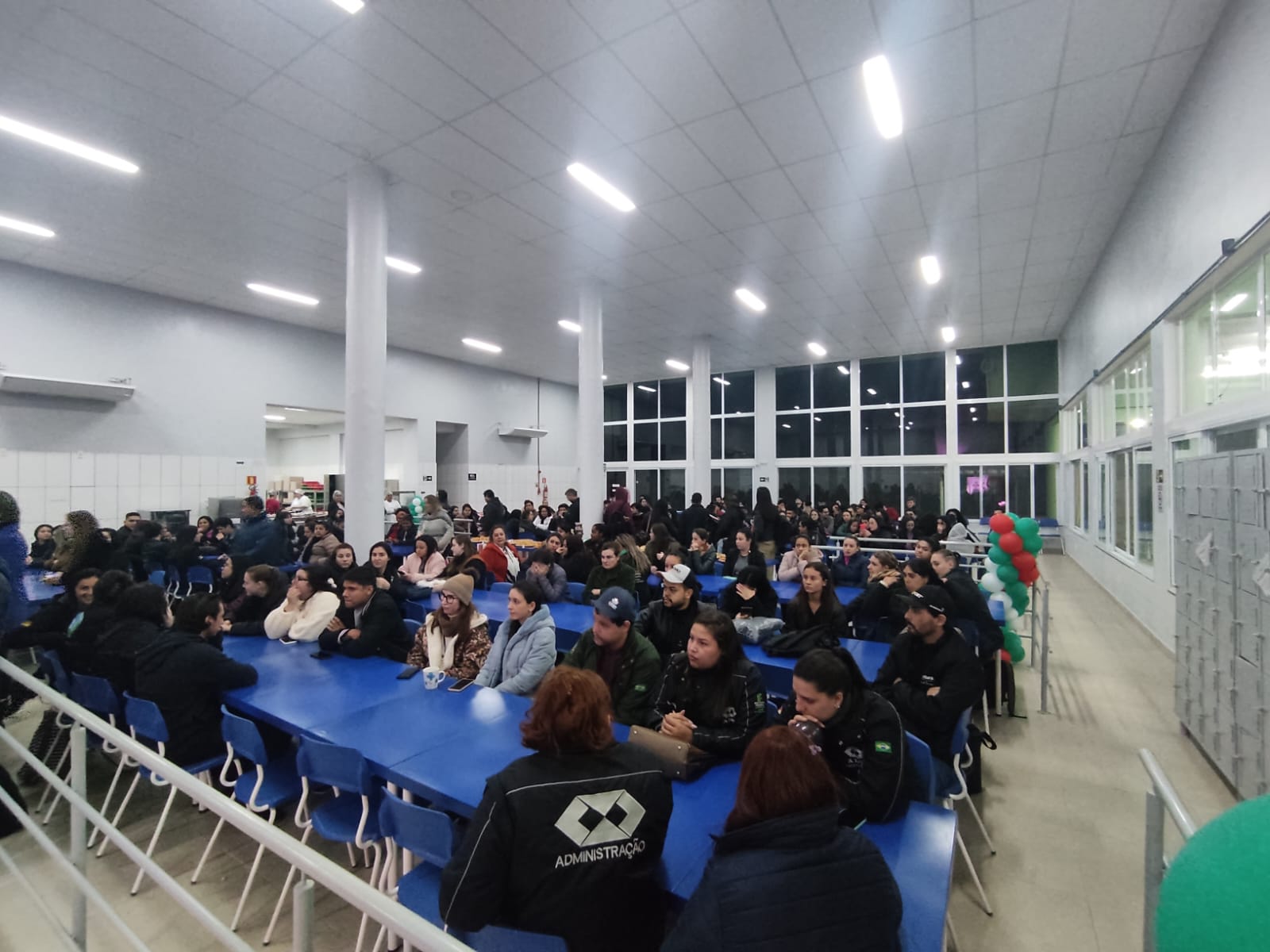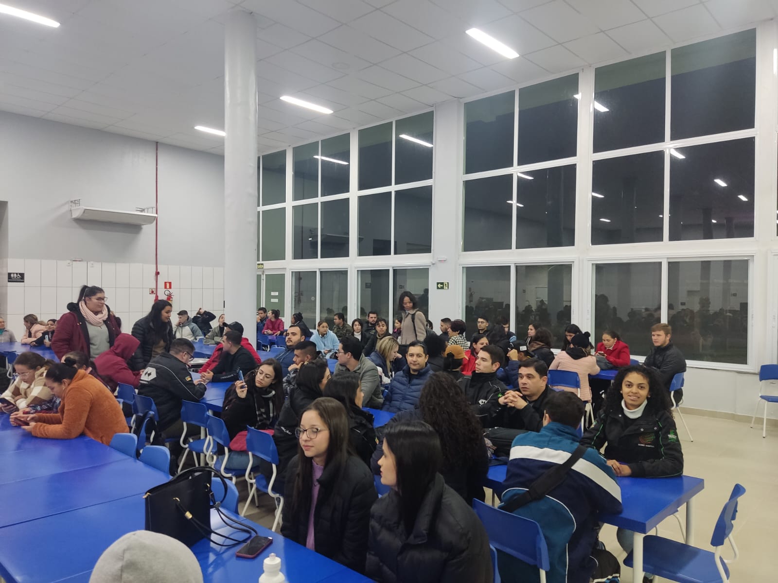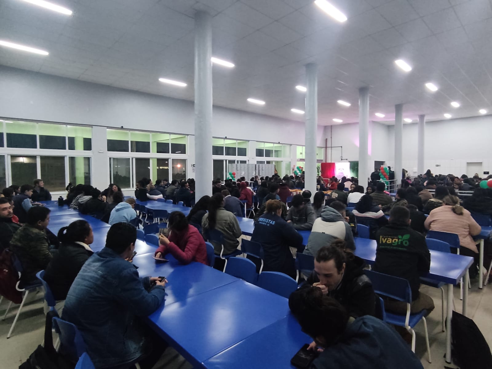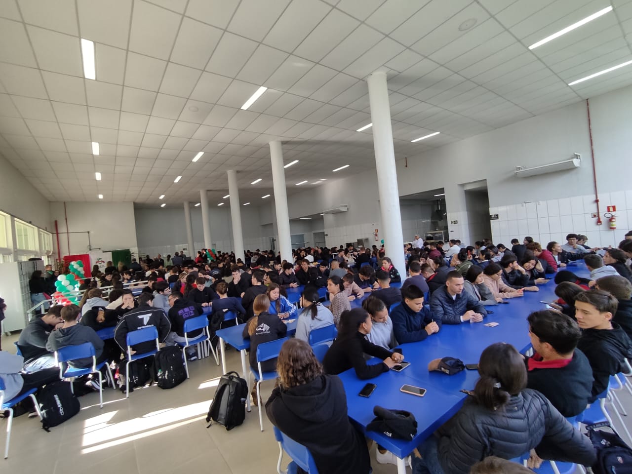 Os/as alunos/as da noite também foram recebidos no novo refeitório. Teve uma pequena fala do diretor Rodrigo Carlotto que discorreu sobre a história do campus e a importância de cada estudante para a instituição. Após teve música ao vivo com o professor Ale, o servidor Ciro Adilson Atzler e o estudante Felipe Braz (2° ano do Técnico Integrado em Agropecuária) e o lanche coletivo.