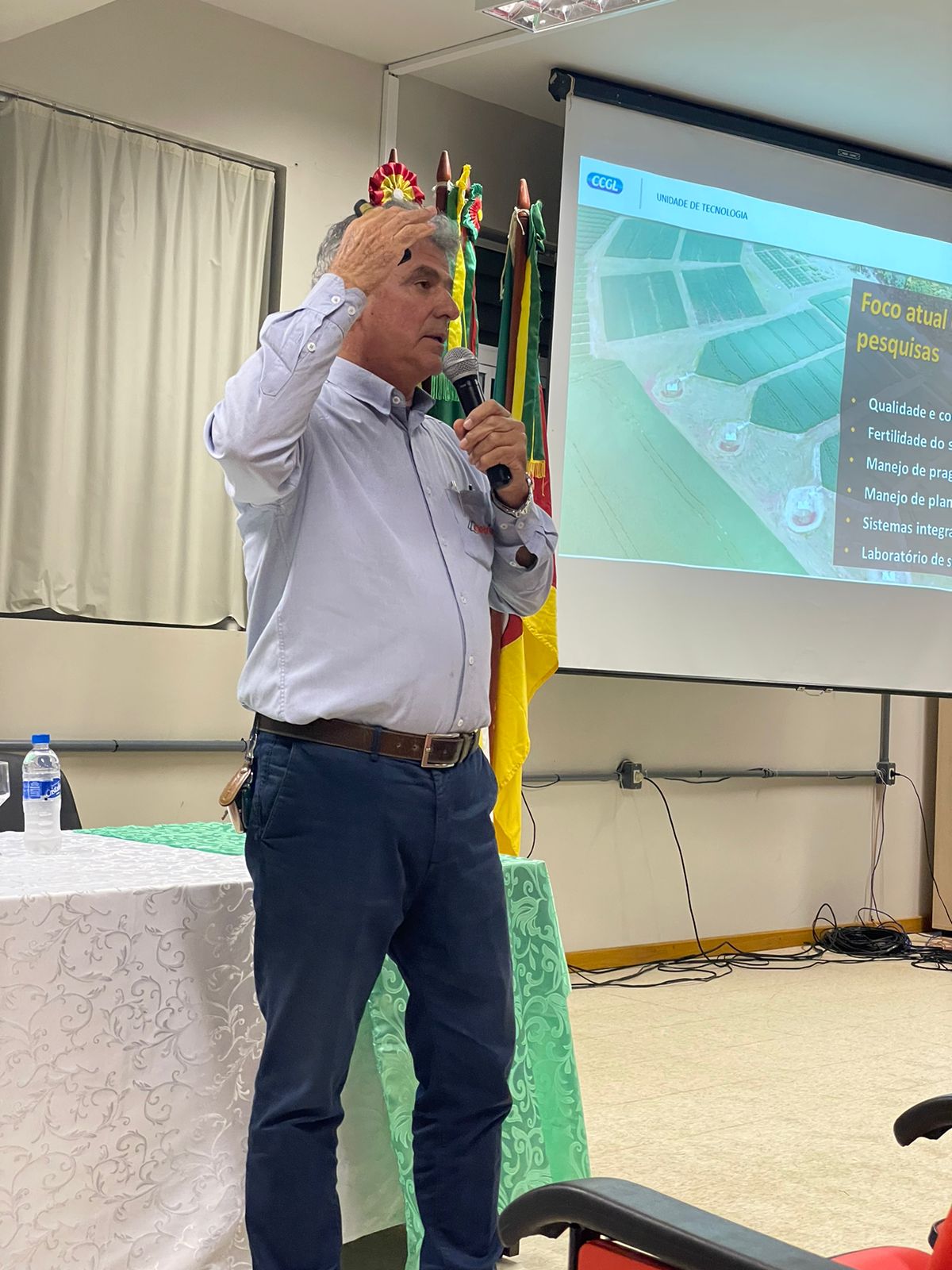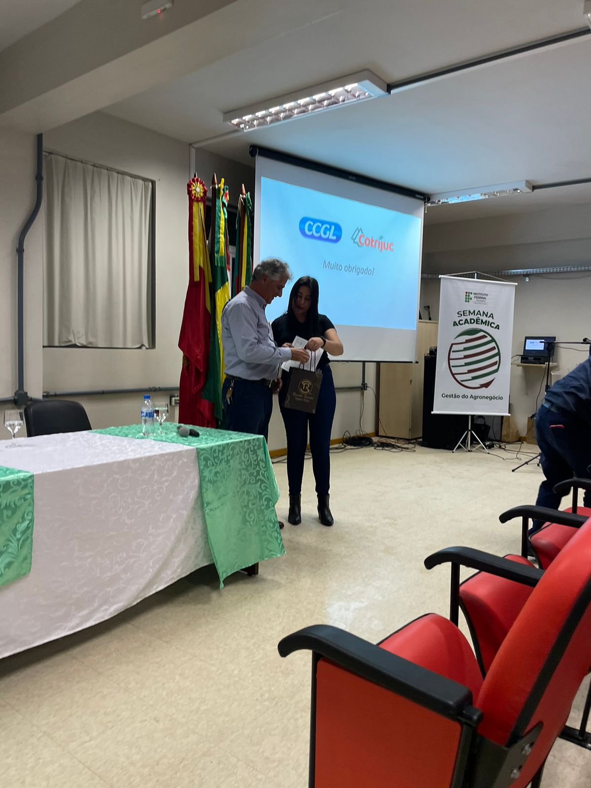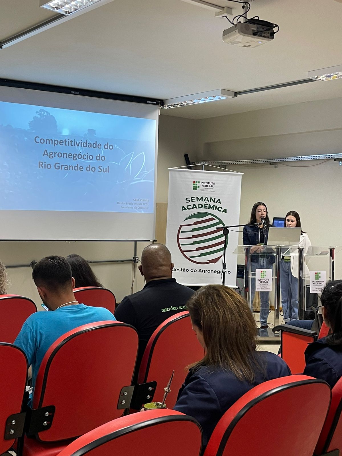Após a abertura aconteceu a palestra com o presidente da Cotrijuc e da Cooperativa Central Gaúcha Ltda (CCGL), Caio Viana. Ele começou sua fala destacando que a educação é o maior bem que a pessoa pode ter, que a escola deve formar cidadãos além de profissionais e que o IFFar vem fazendo um bom trabalho. O agrônomo mostrou dados do agronegócio no Brasil e compartilhou resultados de pesquisas na CCGL, tanto na parte tecnológica como no estudo dos solos. Falou dos resultados financeiros da CCGL, da importância da gestão nas propriedades rurais, como isso interfere na produção e nos resultados e destacou as parcerias com governos que buscam a cooperativa. “O que está mais deficiente nas propriedades é gestão, não é a parte técnica, essa está bem atendida. O produtor precisa saber quanto gasta, para saber quanto o produto custa e se está tendo lucro na venda” disse o agrônomo.