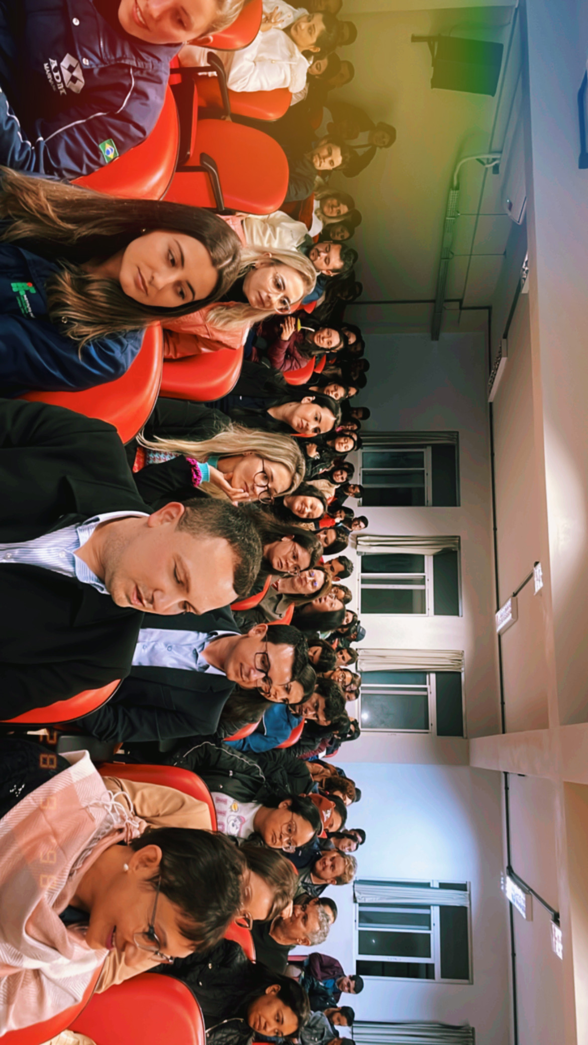 O presidente do D.A. agradeceu a presença de todos/as, especialmente dos/as colegas do diretório Conexões, que prepararam o evento e das empresas apoiadoras. Na sequência, a professora Rosângela destacou alguns números do curso de Administração: 140 estudantes ativos/as e destes 35 estão fazendo o trabalho de conclusão de curso. Ela destacou que a palavra-chave dessa semana é aprendizado e que mais de 30 pessoas colaboraram na organização.