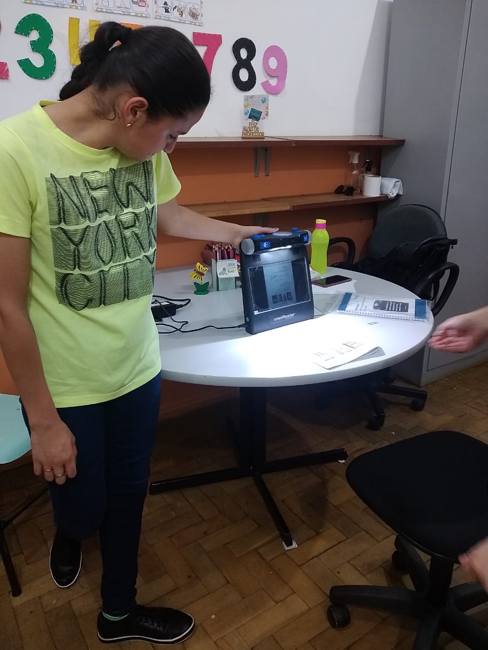 Conforme Fernanda, durante a visita Vitória pode experimentar o recurso e os/as servidores/as compartilharam informações sobre os desafios e as possibilidades de importação de equipamentos dessa natureza para ampliar a inclusão de estudantes com deficiência visual.