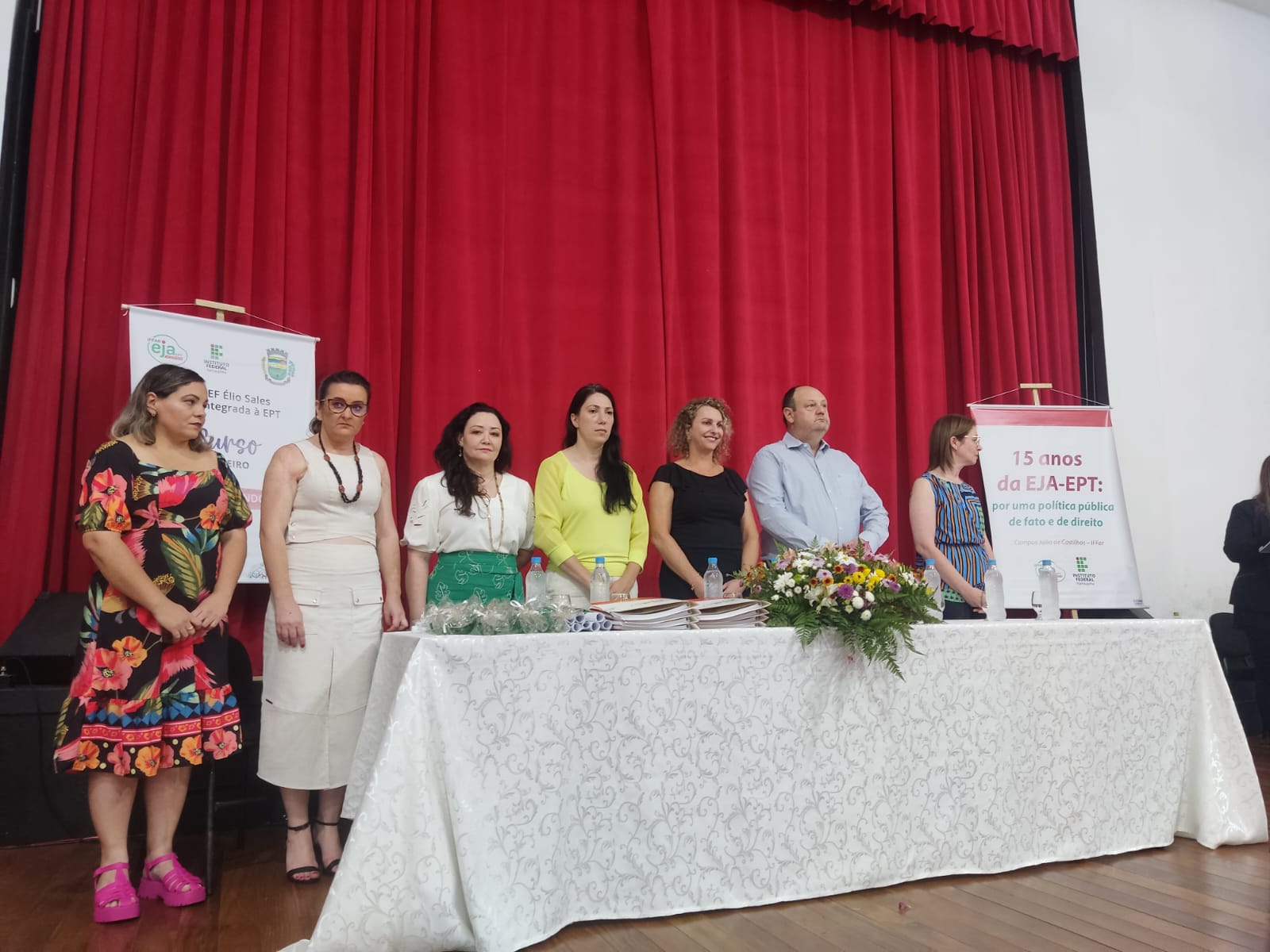 Os cursos técnicos integrados em Comércio – modalidade PROEJA - e Informática tiveram sua entrega de diplomas na terça-feira, dia 19 de dezembro no Centro Cultural Álvaro Pinto. Foram sete (7) concluintes do Comércio, entre eles, Maria Lenir Pereira de Moraes Câmpara, de 72 anos que emocionou o público ao se formar no ensino médio e técnico. A oradora do Comércio, Tuane da Silva Lima, evidenciou que “nesses dois anos de convivência enfrentamos muitas pedras pelo caminho, mas com o apoio um do outro e dos professores não desistimos, enfrentamos calor, frio, chuva e vento, e hoje estamos aqui realizando um sonho. Nossa turma se uniu como uma família onde um não desistiu do outro.”