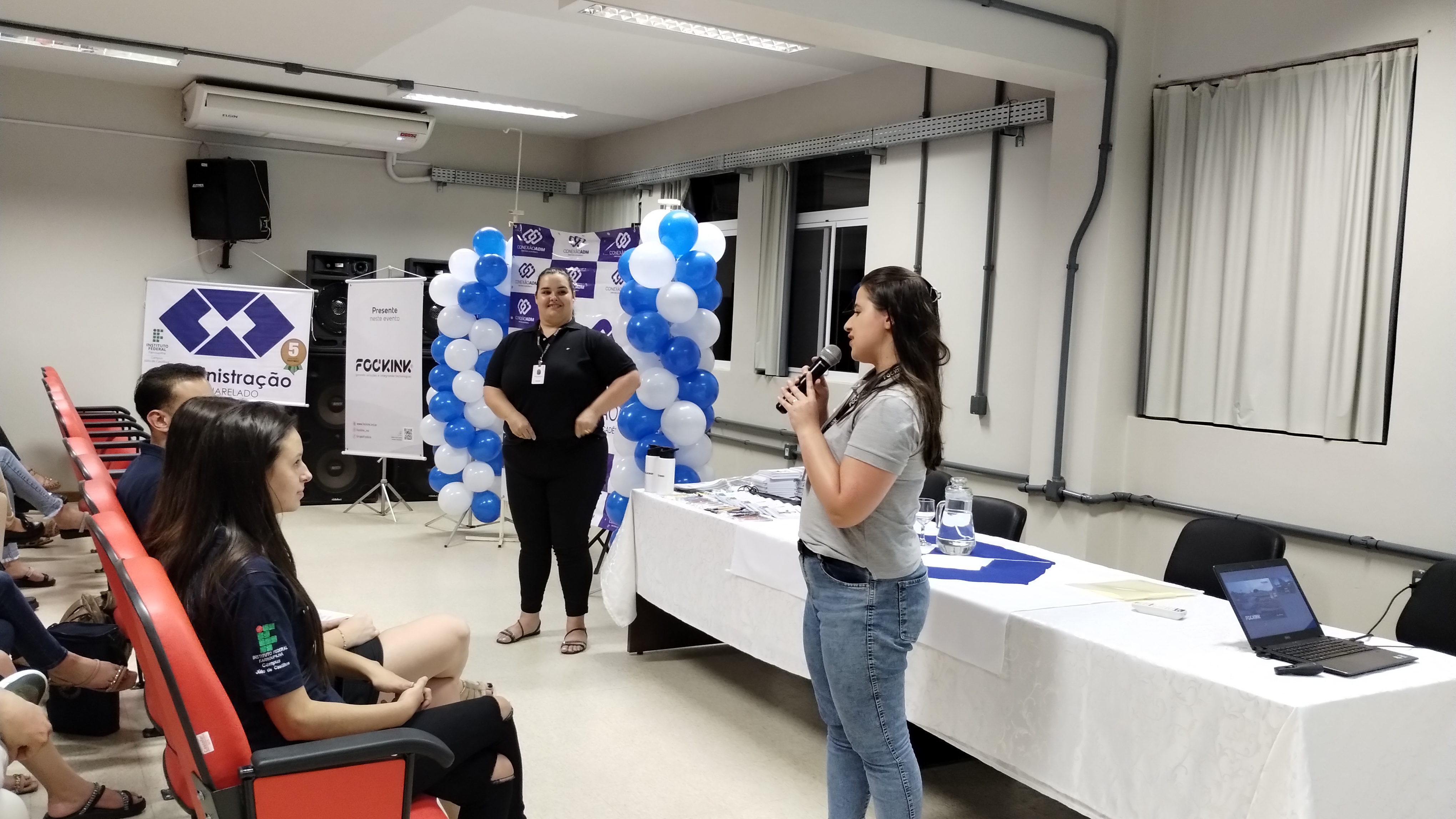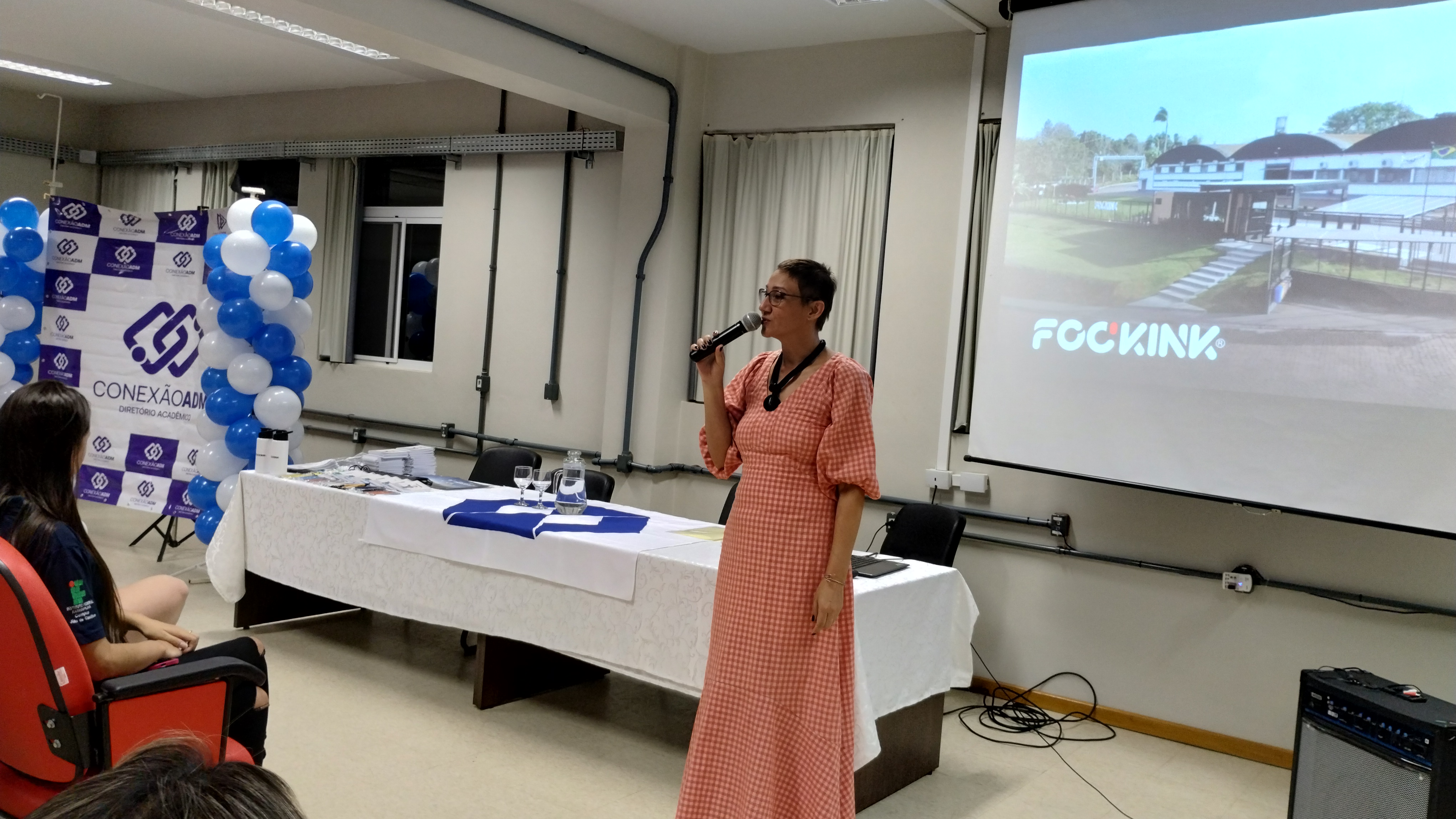 A aula Fockink: nossa história, integrando tecnologias e oportunidades teve início com Milena e Marciele contando sobre suas trajetórias pessoais até chegarem na empresa e como se desenvolveram na empresa. Milena questionou para que áreas os/as alunos/as querem ir ao terminar o curso e a maioria não soube responder. Ela continuou dizendo que isso é normal e acontece com ela também. Assim, Milena destacou a importância do estágio para se que a pessoa se identifique com que rumo tomar. Ela narrou que foi dessa forma que foi parar na área de gestão de pessoas. Atualmente, Milena é responsável pela seleção e recrutamento de pessoas.