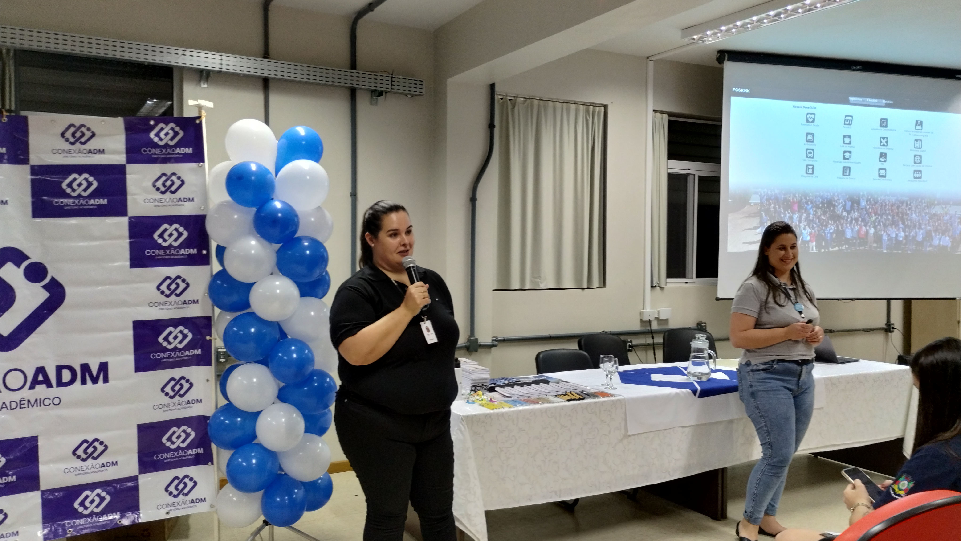 Ao final, Milena e Marciele falaram das oportunidades de trabalho e estágio abertas na Fockinck. Elas mostraram o site da empresa e apontaram a aba skeel, lugar onde os/as candidatos/as podem aplicar para uma vaga. Além das vagas, as administradoras contaram sobre os benefícios oferecidos pela Fockinck, com destaque para a parte da saúde e alimentação.