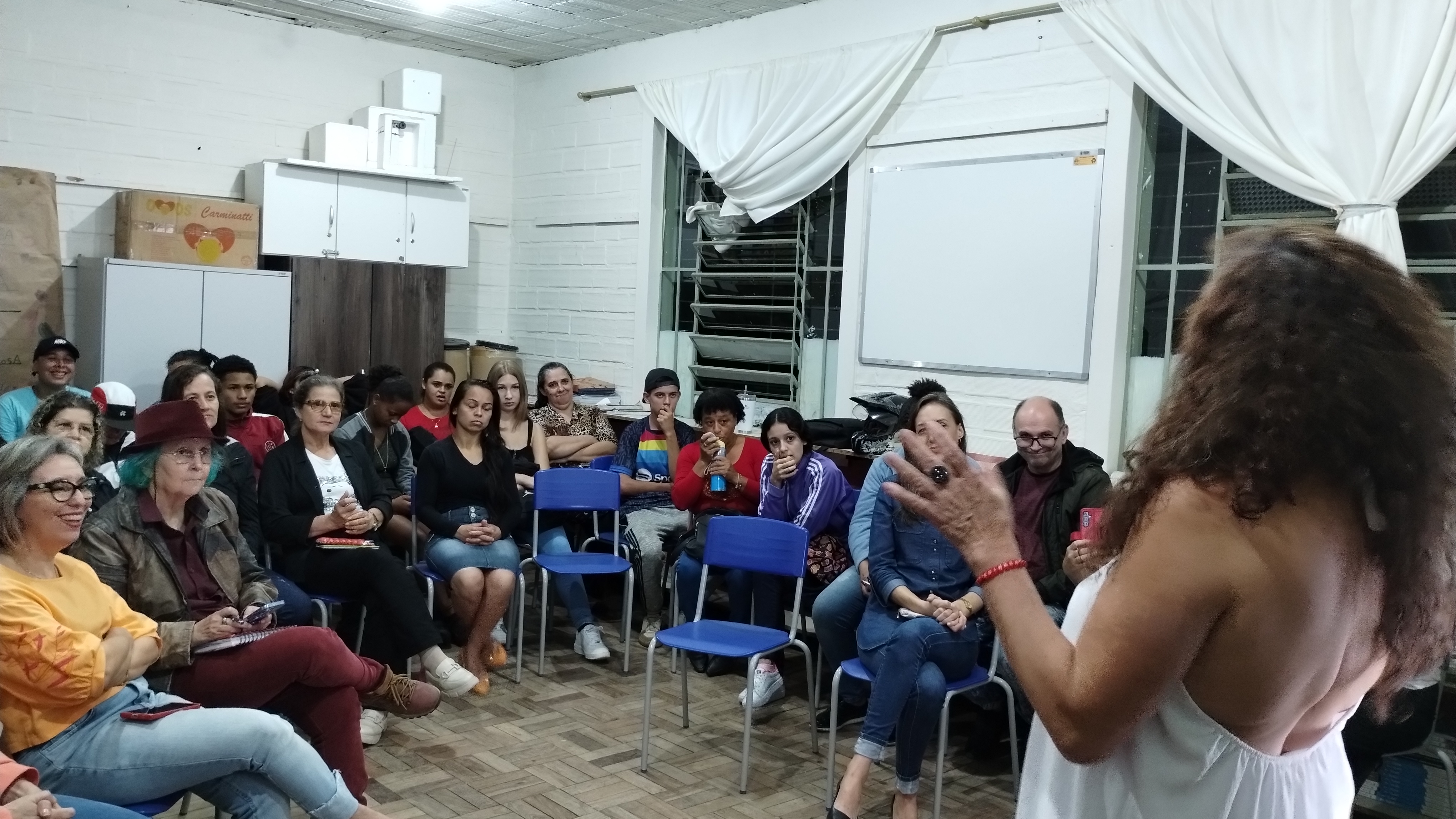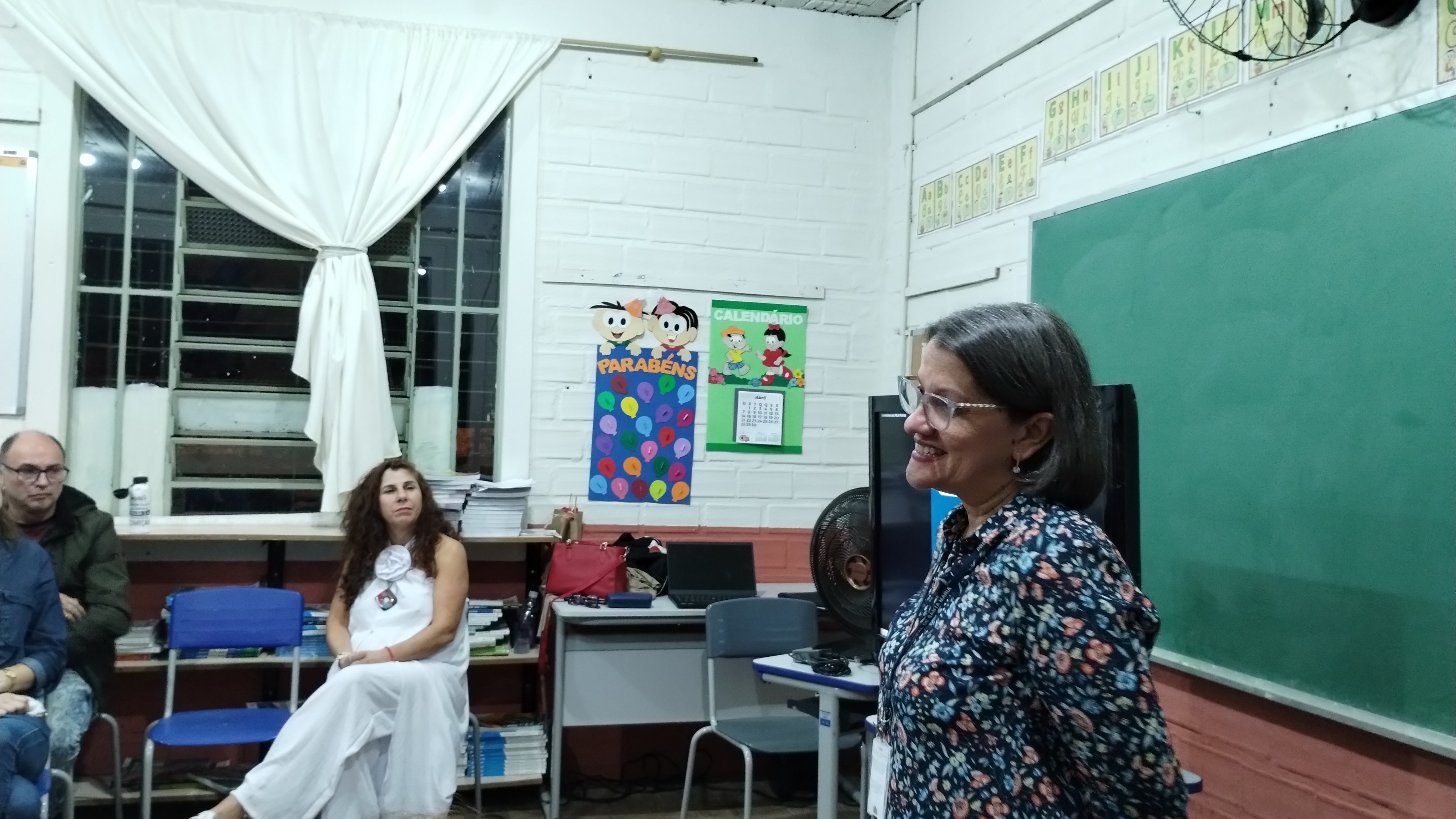 Por fim, chegou a vez de Edinara falar aos presentes. Ela iniciou falando que gosta muito do que faz e faz tudo de uma forma criativa, com entusiasmo. Colocou a música Alma, de Zélia Duncan para tocar e questionou como eles/as viam sua alma. As respostas apontaram para o lado positivo que vemos em nós mesmos, mas também das nossas sombras. Edinara continuou falando de sua experiência trabalhando com alunos/as do noturno, de como é diferente quando os/as estudantes são também trabalhadores/as e contou de quando propôs uma semana literária, eles/as fizeram, mas do seu jeito, alterando completamente a proposta inicial.