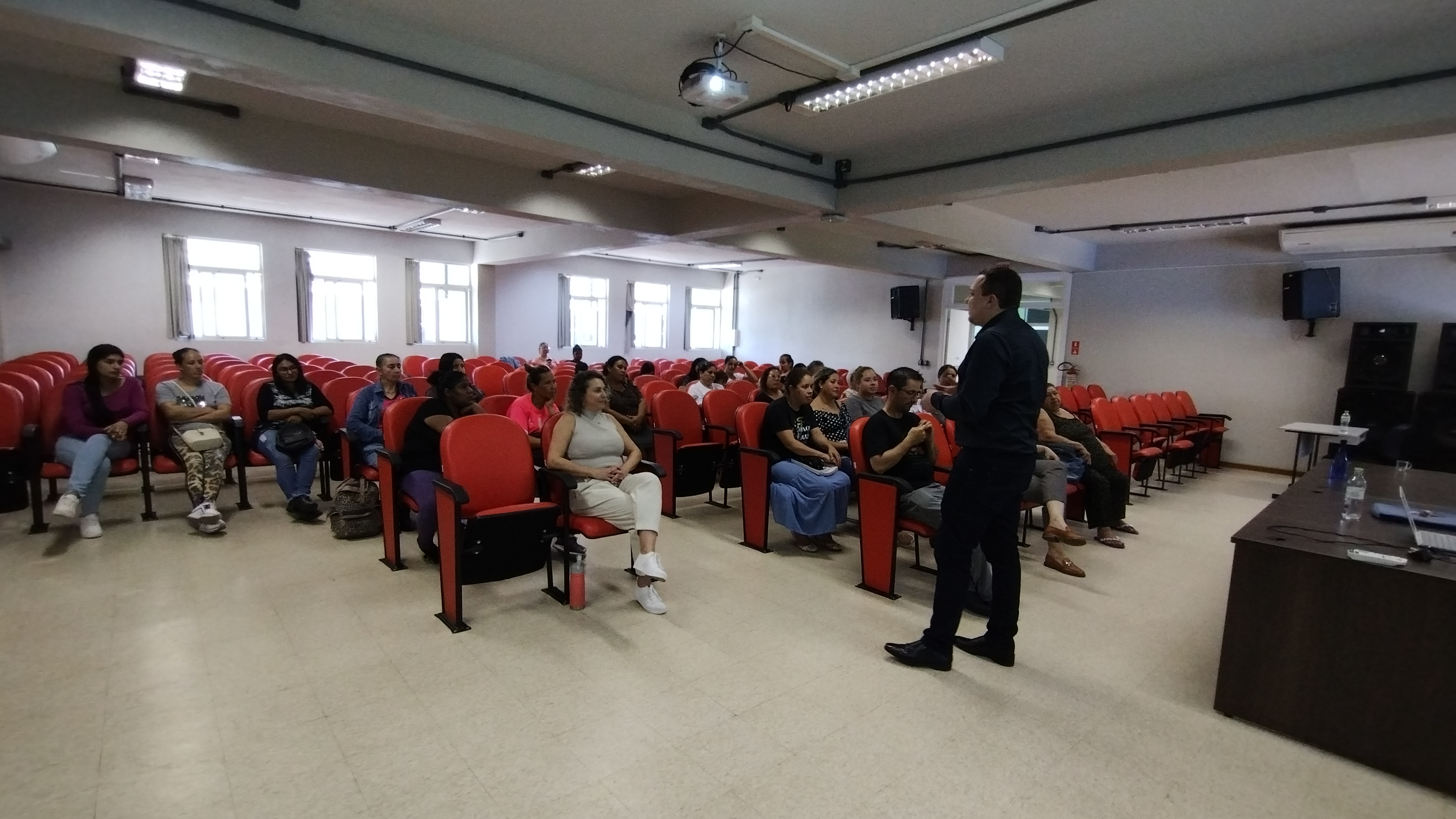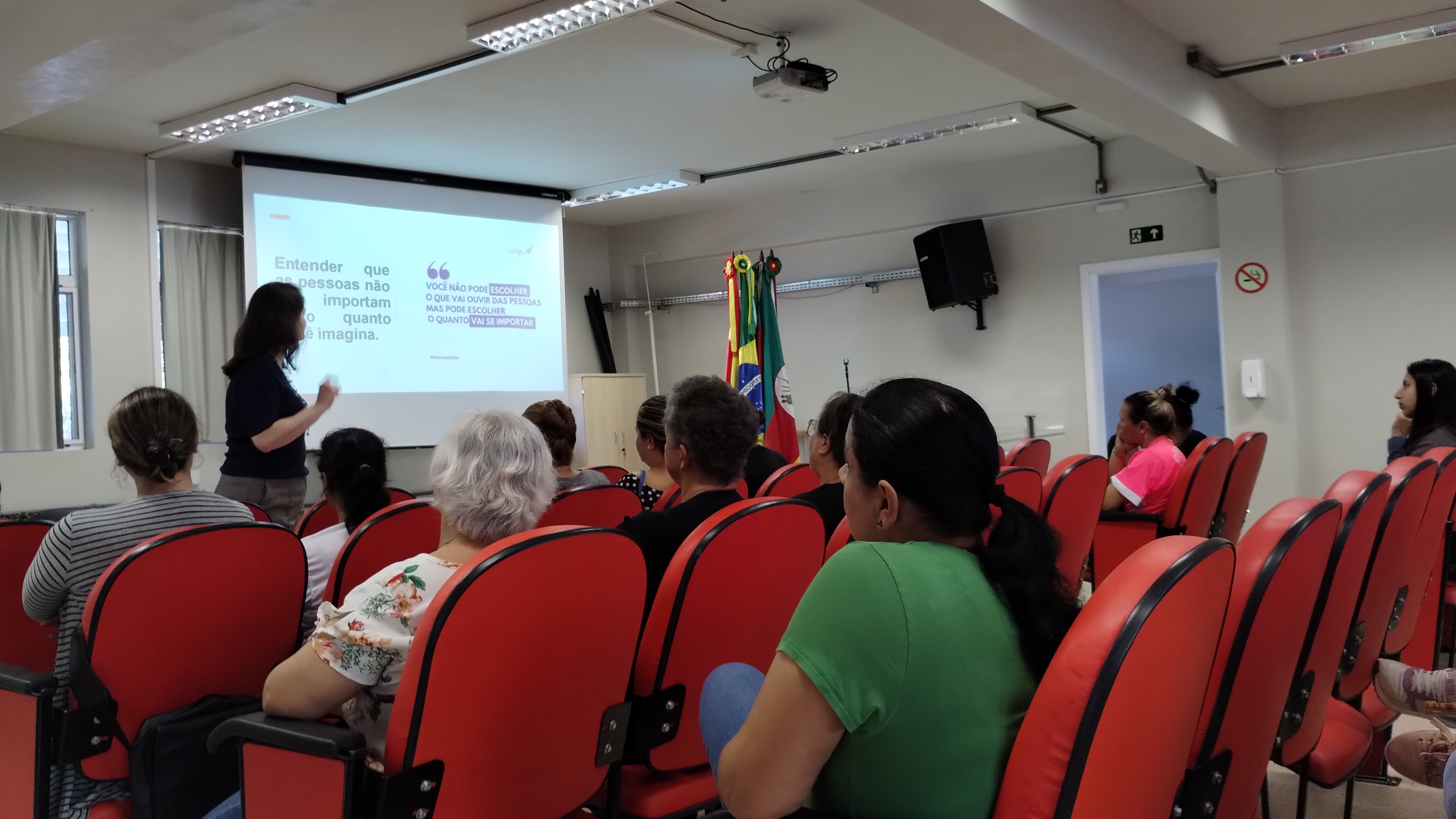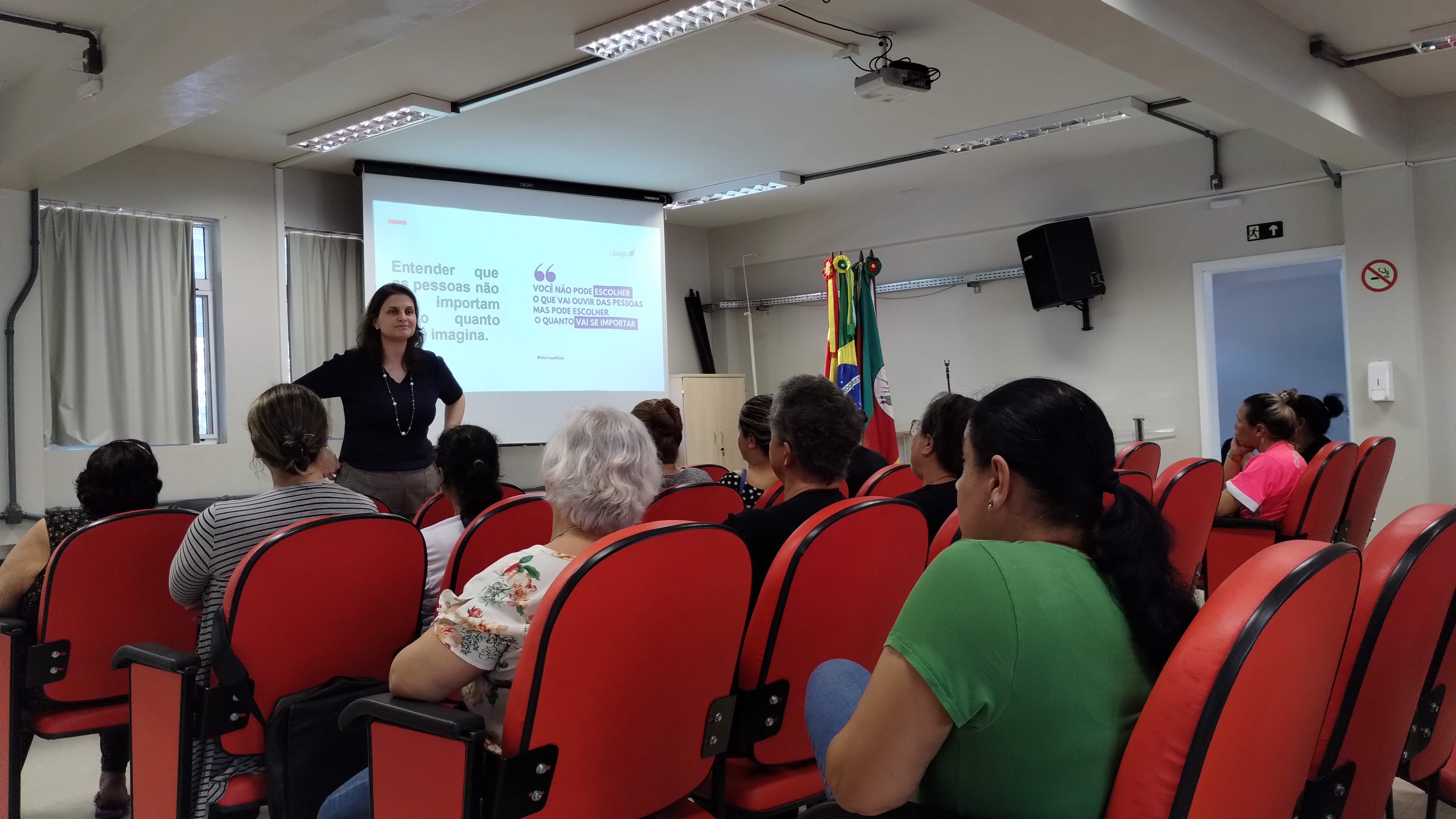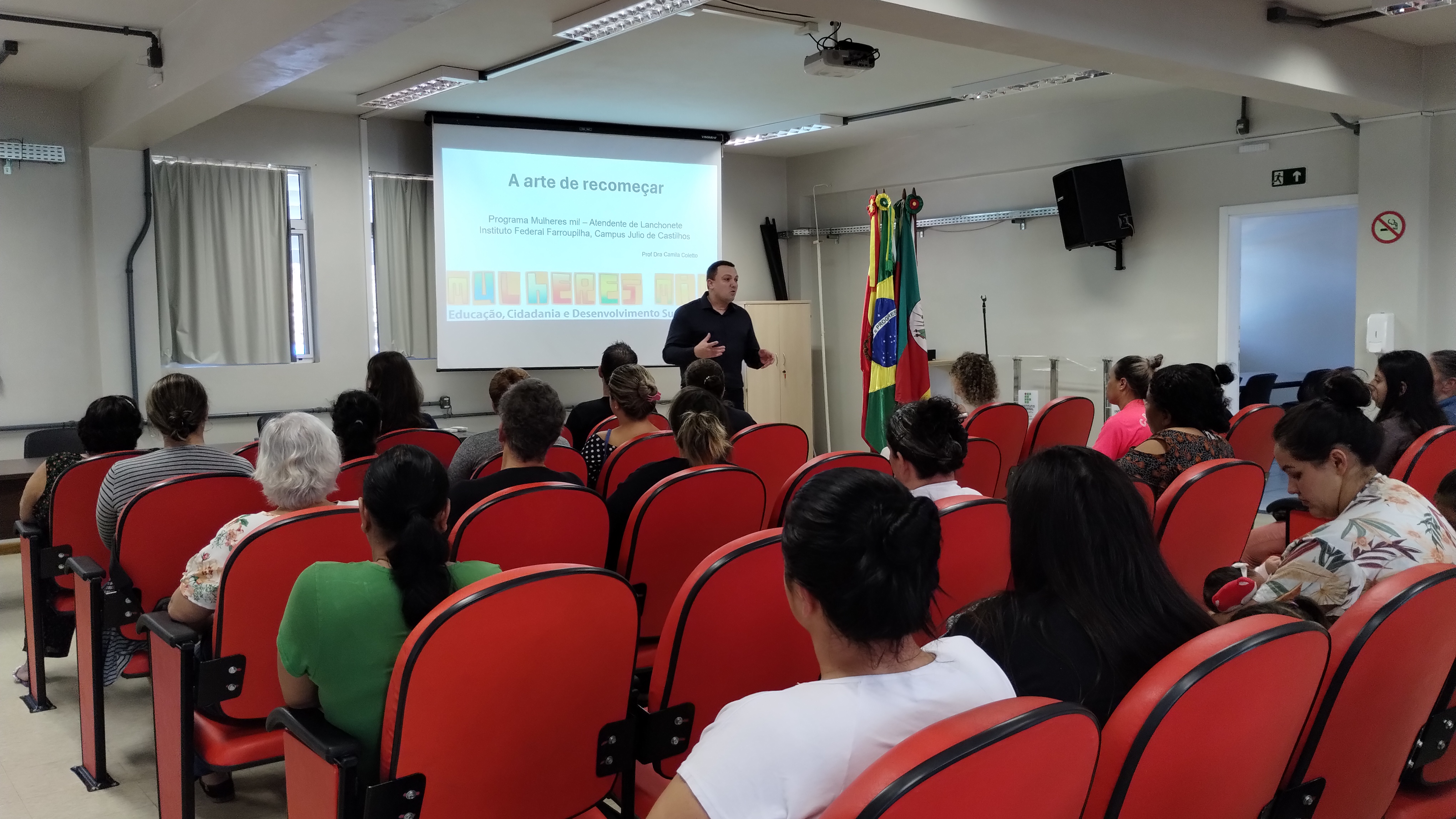 Após uma pausa devido às chuvas e à greve, as aulas do Programa Mulheres Mil retornaram na tarde desta terça-feira (11) com a palestra “Recomeçar”, com a coordenadora do projeto e professora do curso de Atendente de Lanchonete, Camila Coletto. Também estiveram presentes o diretor geral, Rodrigo Carlotto, a diretora de ensino, Silvia Montagner e o diretor de pesquisa, extensão e produção, Juliano Perlin além das alunas, sendo que muitas delas compareceram com seus/uas filhos/as.