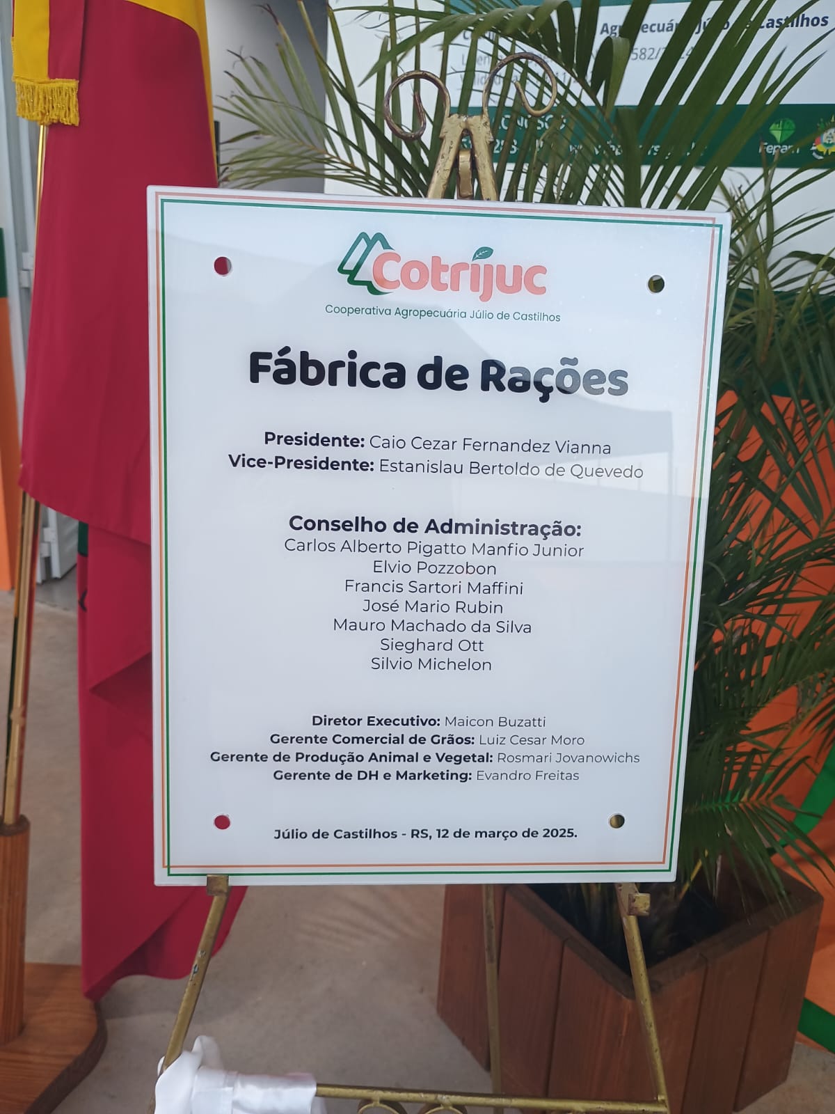 O diretor enfatiza que a inauguração desta nova unidade representa um avanço significativo para a cooperativa e para o agronegócio local, reforçando o compromisso da Cotrijuc com o desenvolvimento sustentável e a qualidade na produção de alimentos para o setor agropecuário. Por fim, deseja sucesso ao empreendimento.