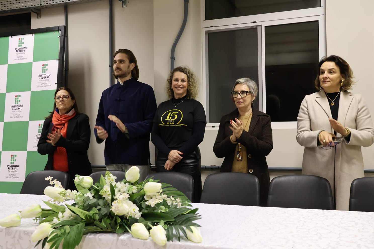 Em sua fala, a diretora-geral, professora Sílvia Montagner, destacou que a EJA extrapola a sala de aula ao proporcionar experiências como o Bazar do Proeja, a Feira de Negócios e as viagens de estudo. “São ações que aproximam os estudantes do mundo do trabalho e fortalecem seu desenvolvimento cidadão”, afirmou. A coordenadora institucional da EJA, professora Cléia Tonin, reforçou: “Mais do que números, esses 15 anos representam histórias de vida, sonhos realizados e futuros reconstruídos”.