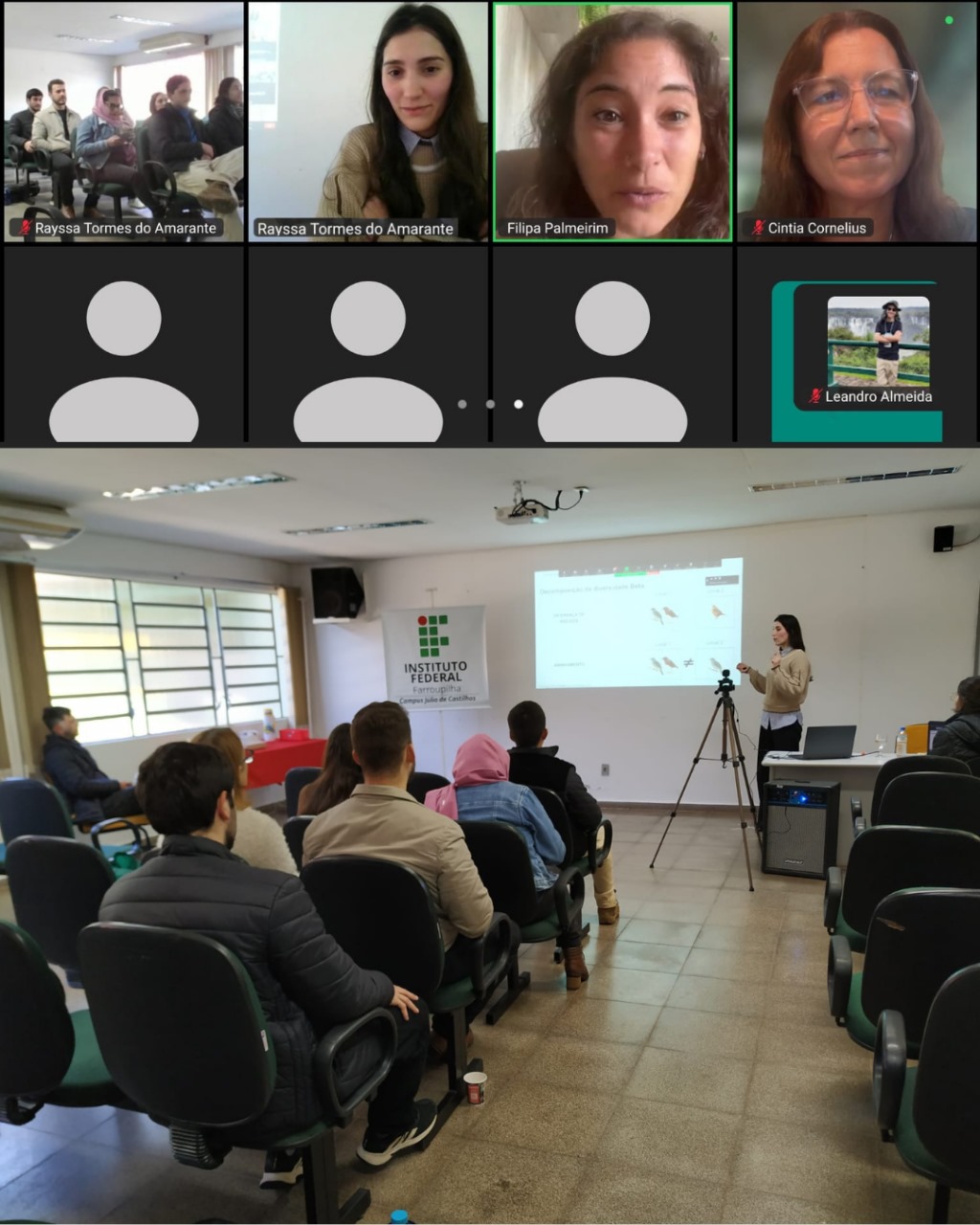 A defesa ocorreu em formato híbrido, com apresentação presencial no auditório do prédio A do IFFar-JC e transmissão simultânea pela plataforma Zoom. Participaram 26 pessoas, sendo nove presencialmente e 17 remotamente. A banca avaliadora foi composta por pesquisadores de destaque: a Dra. Ana Filipa Palmeirim (Portugal), professora visitante da Universidade Federal do Pará (UFPA); o Dr. Sérgio Henrique Borges (UFAM); e o Dr. Franchesco Della Flora (IFFar JC). Após a apresentação e a arguição, a dissertação foi aprovada por unanimidade, com elogios à qualidade do trabalho desenvolvido.