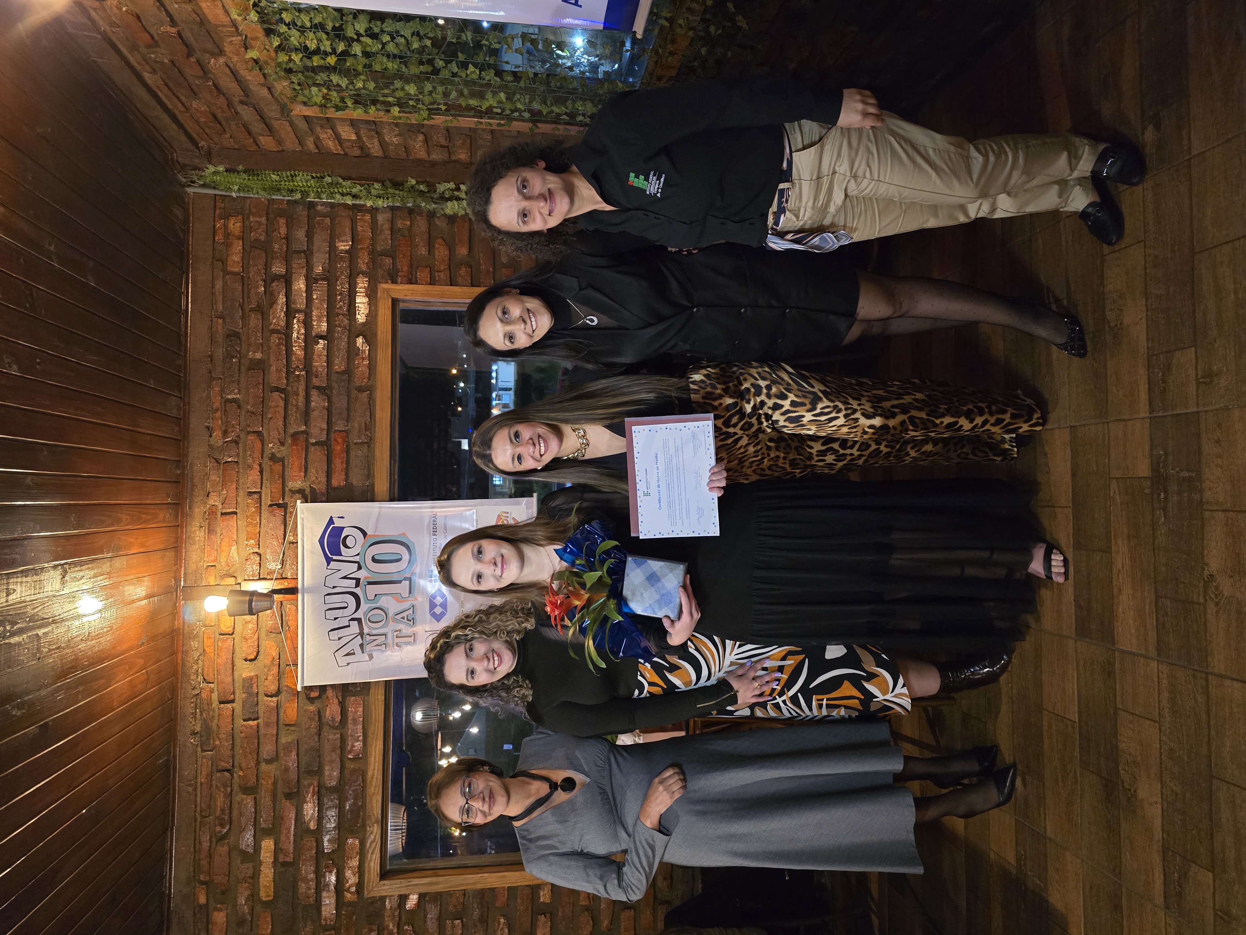 A entrega do reconhecimento ocorreu logo após a palestra da professora Vânia de Fátima Barros Estivalete, que abordou o tema “Planejamento de Carreira em um Mundo em Transformação e a importância do CRA”. Desta maneira, a noite foi marcada por emoção, inspiração e celebração. O estudante homenageado recebeu o certificado de "Honra ao Mérito" que foi entregue pela Diretora do campus IFFAR/JC, Silvia Montagner. Além disso, ganhou uma linda cesta de café da manhã do Supermercado Zanon, parceiro da ação e do evento, entregue por Tamires Schmeling - gerente administrativa do Supermercado, que destacou: “Fazer parte do projeto Aluno Nota 10 nos mostra a importância de potencializar e destacar alunos que estão abertos a se desenvolver, incentivando todos a fazer parte deste time de profissionais brilhantes do futuro!”.