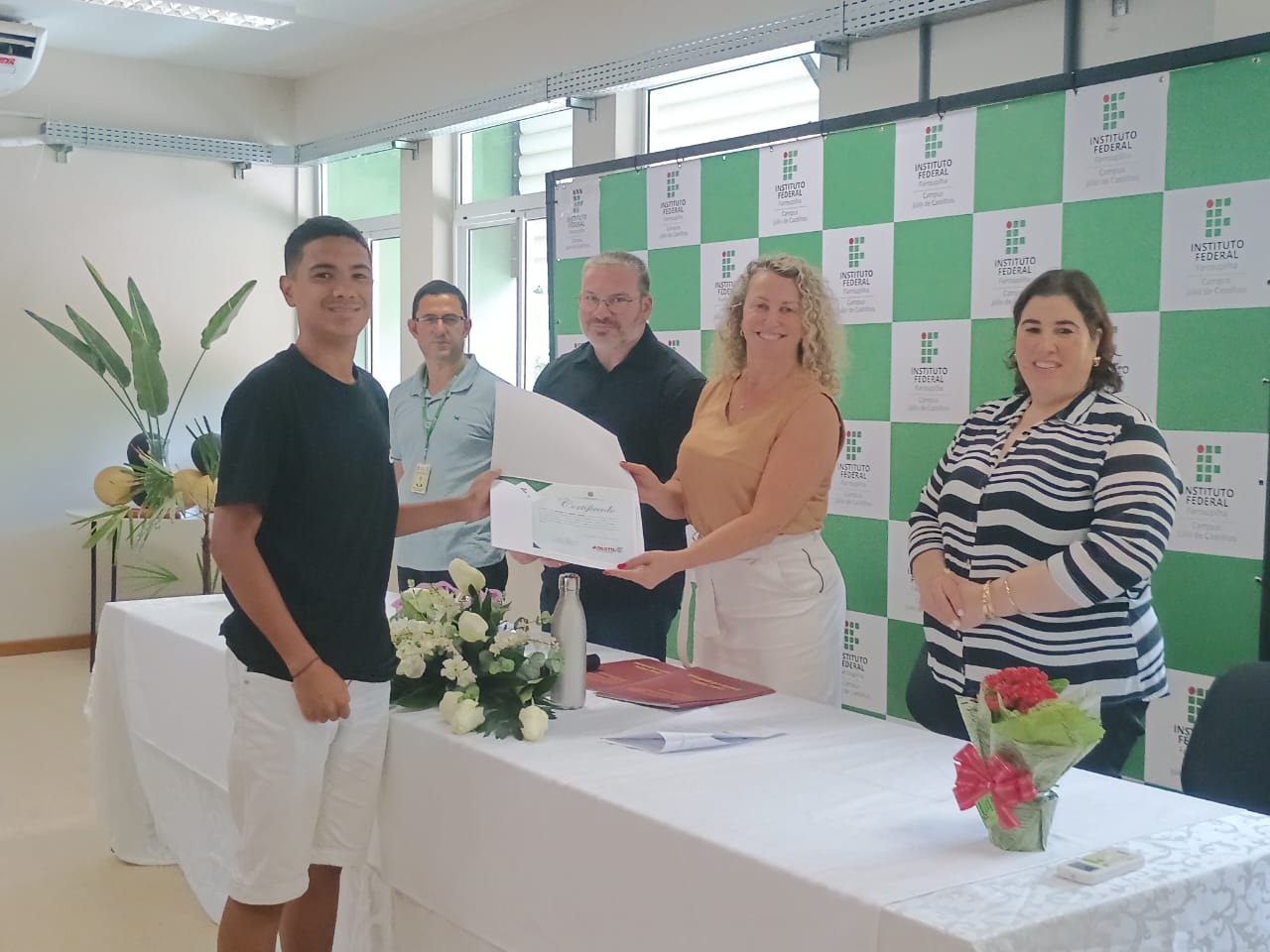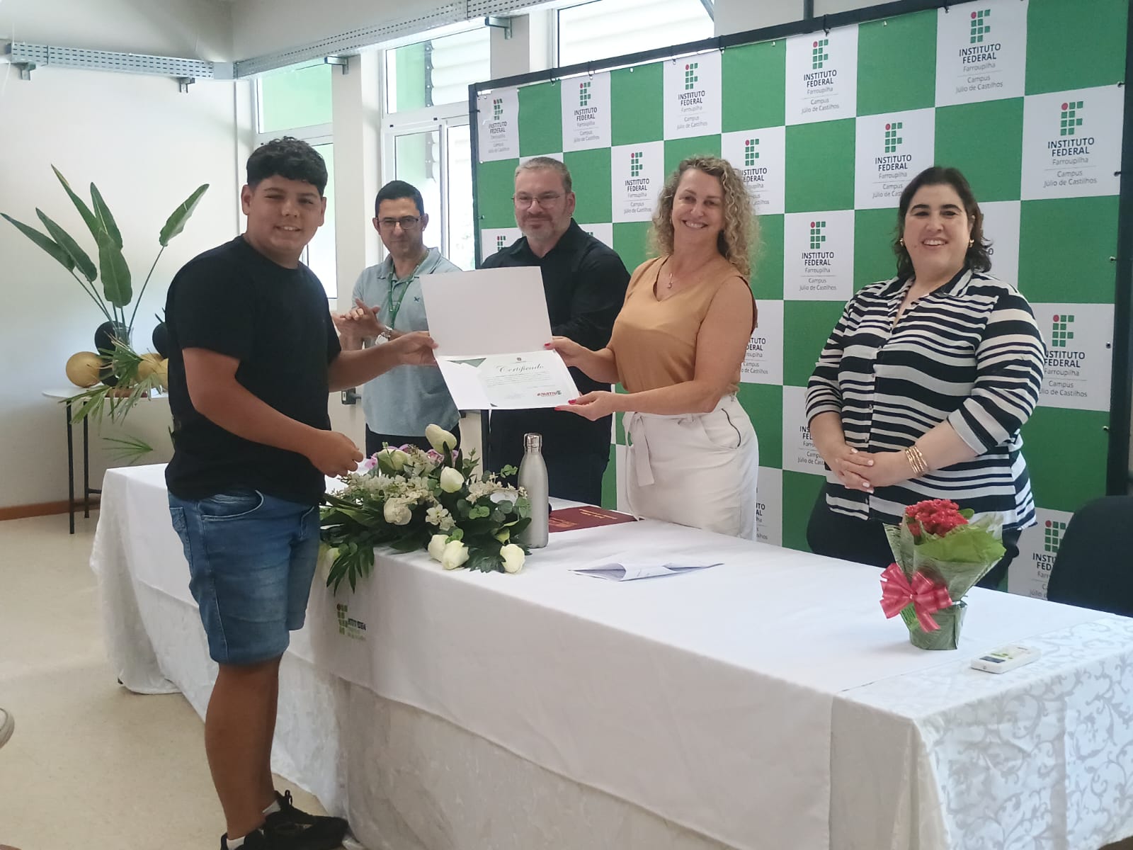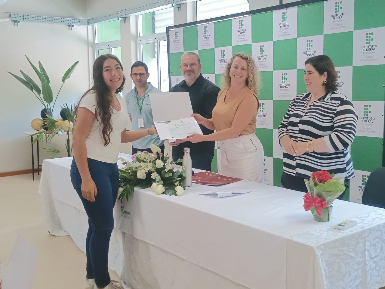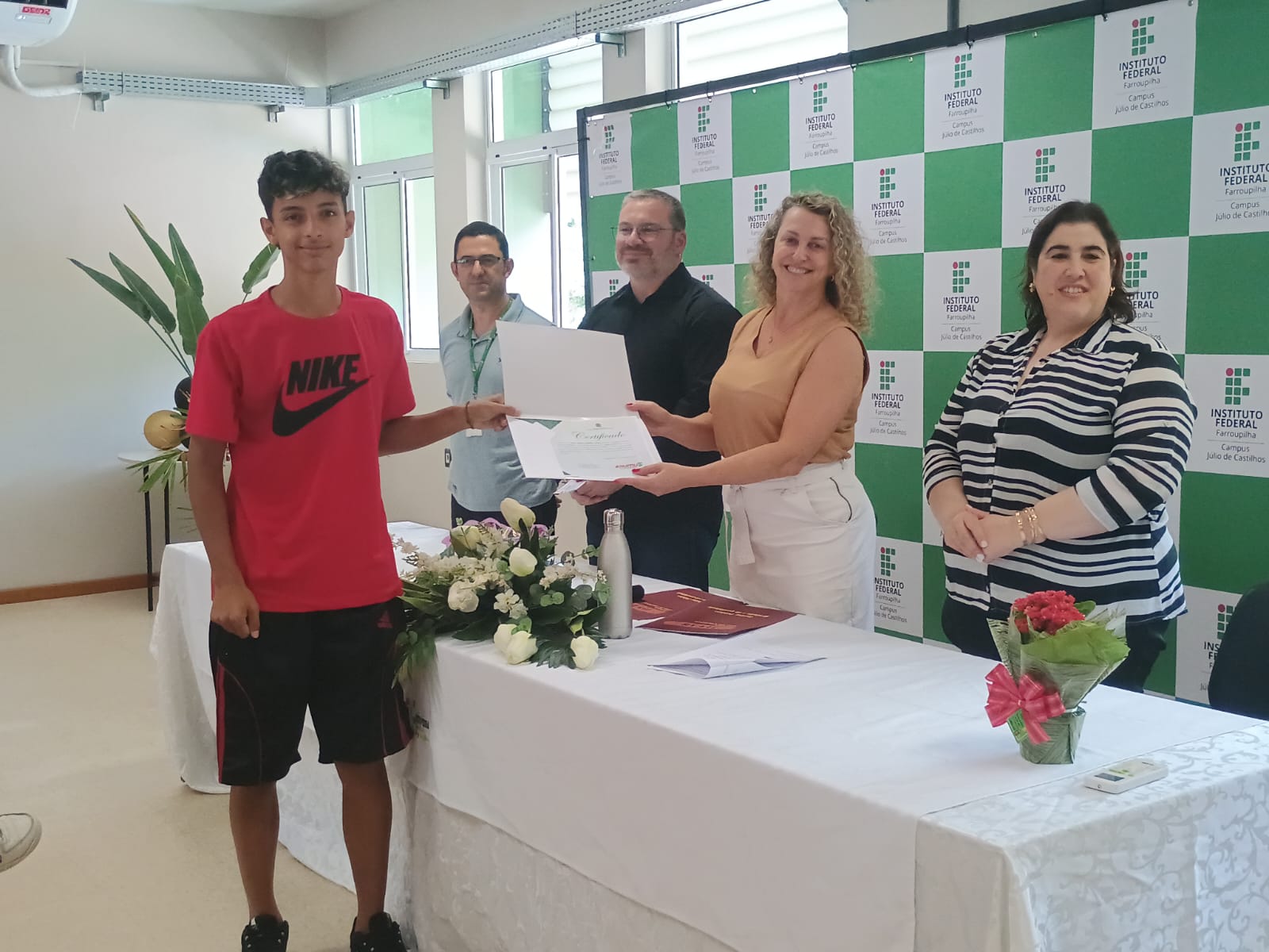 Na sexta-feira, 12 de dezembro, no anfiteatro do prédio administrativo, foi realizada a cerimônia de entrega de certificados aos estudantes que concluíram o curso do Partiu IF. O evento contou com a presença da Diretoria-Geral Silvia Regina Montagner, do Diretor de Pesquisa, Extensão e Produção Roberto Oliveira Weber, do Coordenador Adjunto do Partiu IF Milton Cesar Buzata Maciel, da nova diretora da Escola Júlio Prates, Cátia Dionara Fontela, servidores, docentes do curso e familiares dos estudantes.