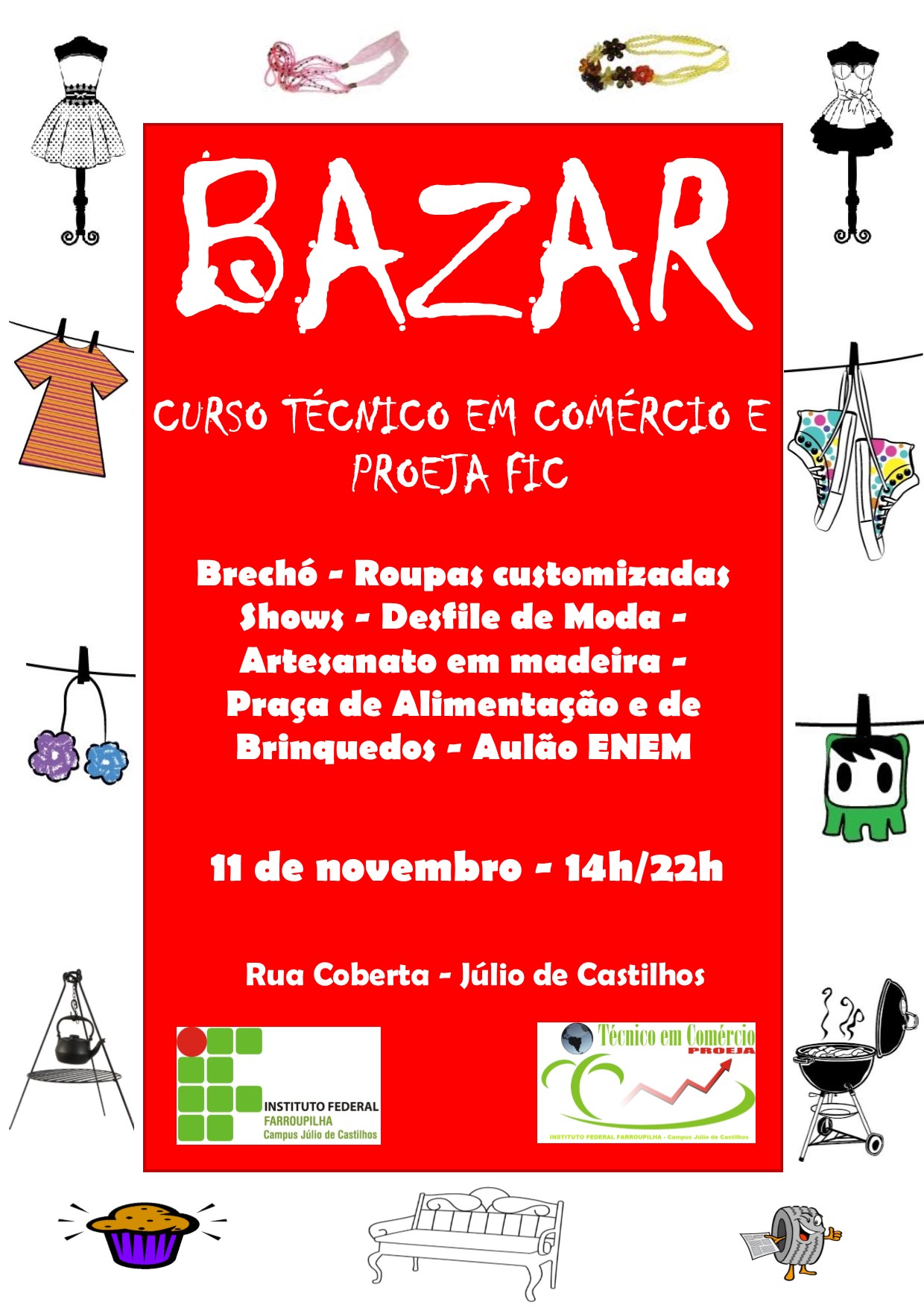 Convidamos estudantes, professores, técnicos administrativos, comunidade castilhense e da região a prestigiar o Bazar do Curso Técnico em Comércio e Proeja FIC. O evento ocorrerá na Rua Coberta de Júlio de Castilhos no dia 11 de novembro (sábado) das 14 às 22h. Inúmeras atividades farão parte do Bazar, desfile de moda, venda de roupas customizadas, brechó, exposição e venda de peças de artesanato em madeira, praça de alimentação e brinquedos, aulão preparatório para o ENEM e shows musicais.