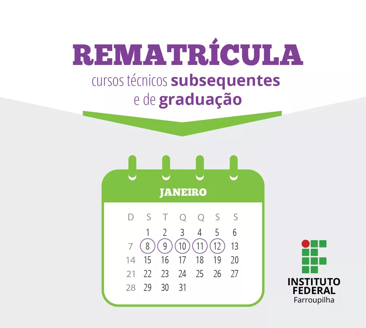 Os alunos dos cursos Superiores e Técnicos Subsequentes do Instituto Federal Farroupilha devem realizar a rematrícula do dia 8 ao dia 12 de janeiro no Portal Discente do SIGAA. A não realização da rematrícula acarreta a perda de vaga.