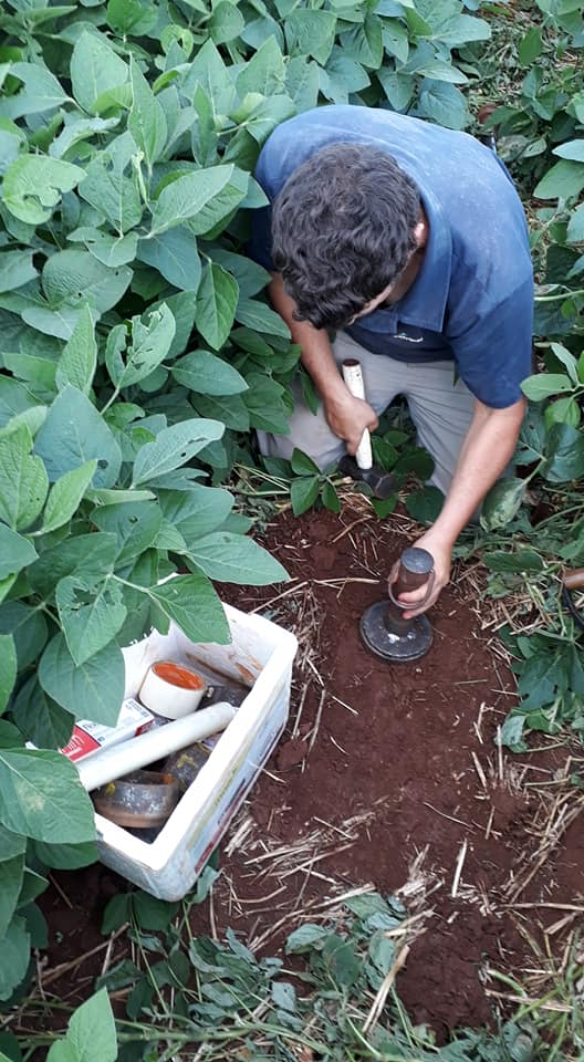 Docentes e discentes do curso superior de Tecnologia em Produção de Grãos do IFFar – Campus Panambi estão conduzindo um projeto de pesquisa que objetiva identificar e caracterizar as modificações na porosidade e densidade do solo em decorrência do uso do pulverizador autopropelido no cultivo da soja. Além disso, o estudo visa verificar a existência de modificações nos níveis de produtividade e rendimento de grãos nas plantas de soja na área avaliada e definir valores de perdas reais, comparando a amostragem com uso do pulverizador terrestre versus aplicação aérea.