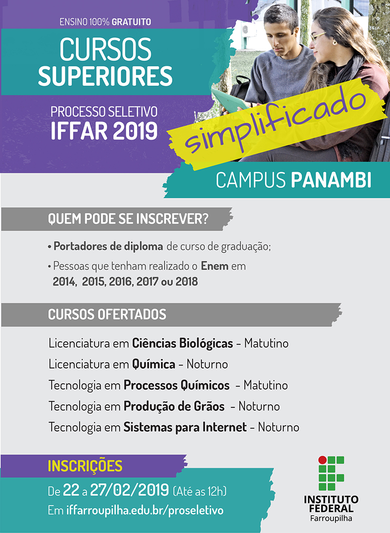 O IFFar lançou edital de seleção simplificada para o ingresso nos Cursos Superiores. Há vagas para cinco diferentes cursos do Campus Panambi. Todos são totalmente gratuitos.