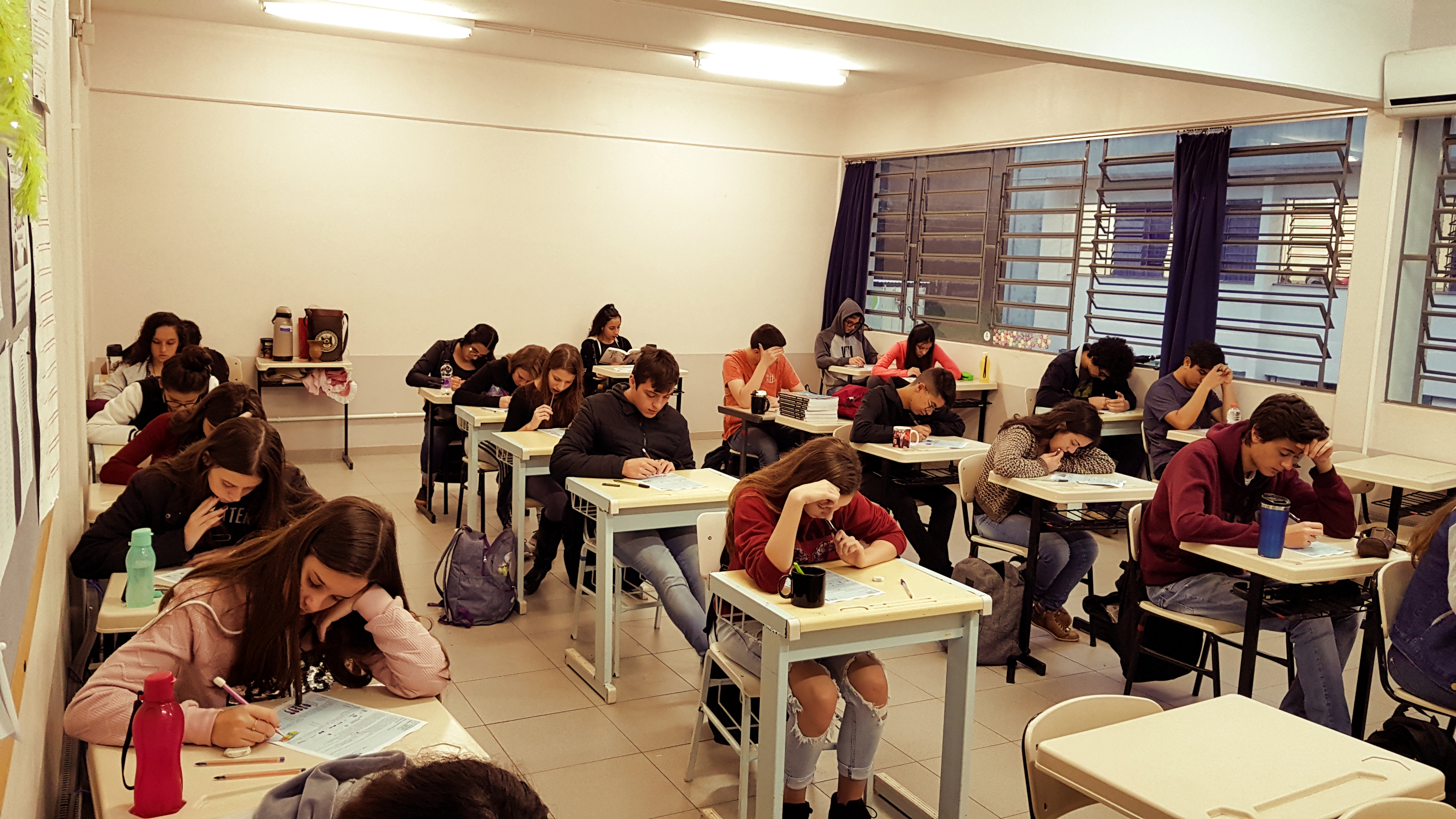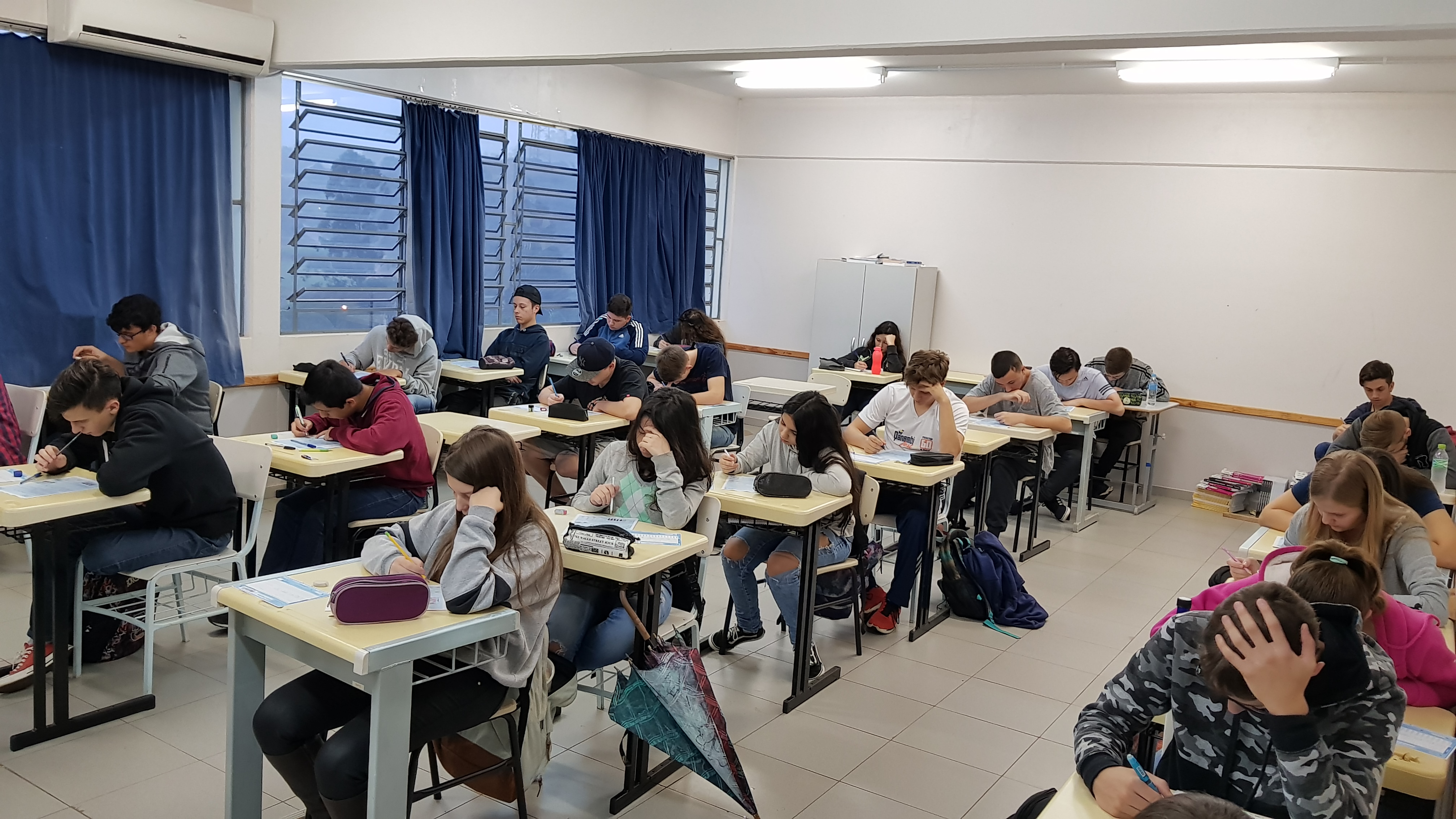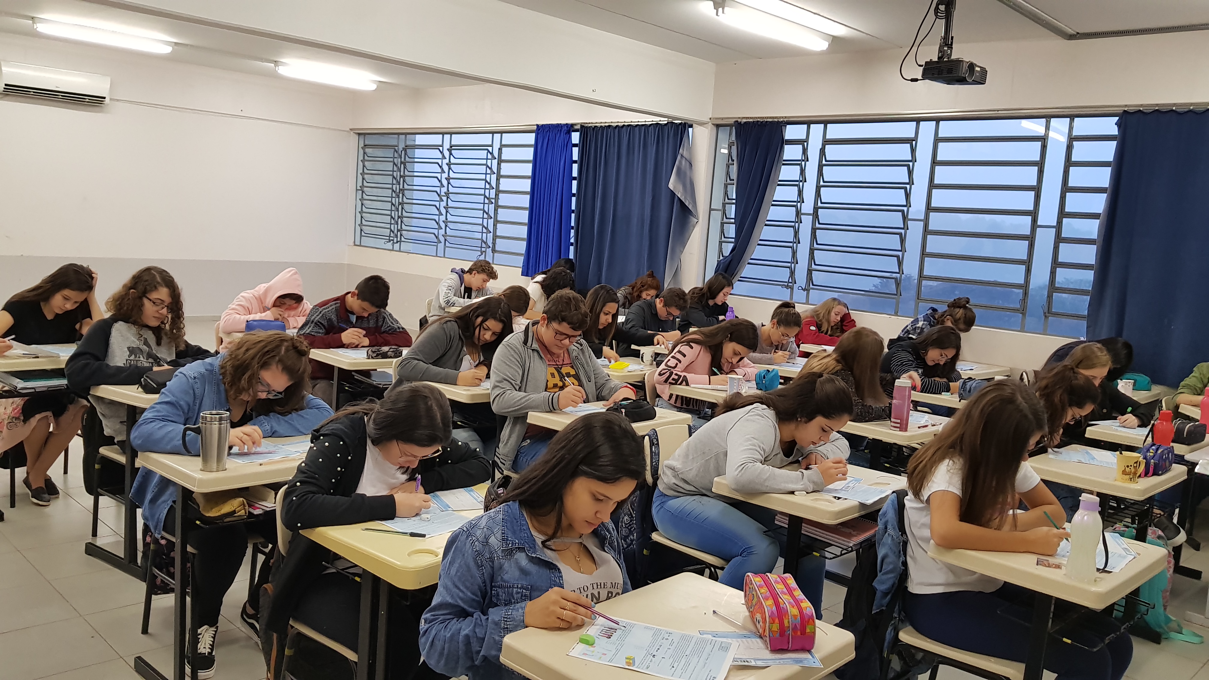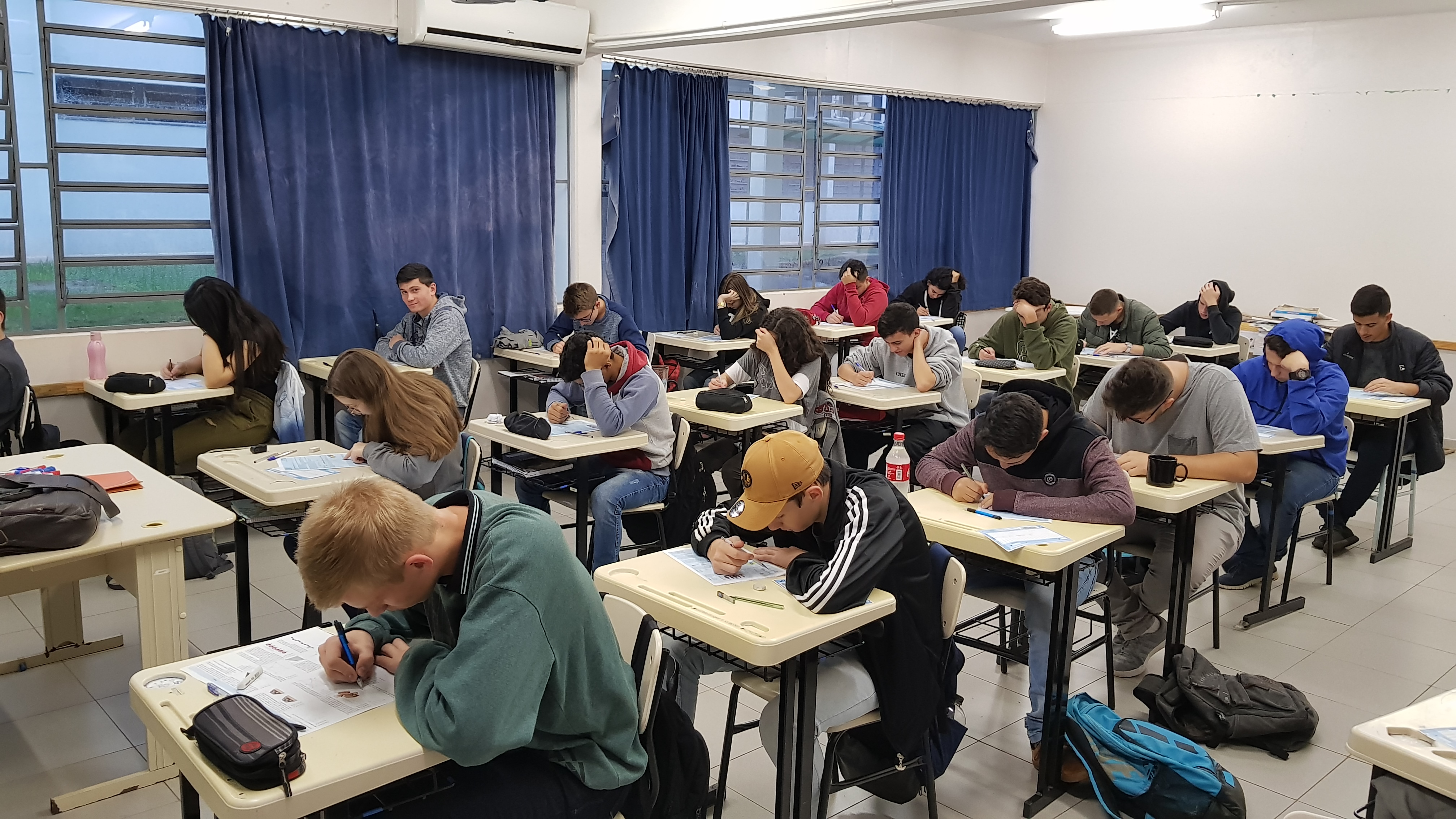 Na terça-feira, 21/05, alunos/as de todas as nove turmas do Ensino Médio realizaram a primeira etapa da Olimpíada Brasileira de Matemática das Escolas Públicas (OBMEP). A Olimpíada é uma realização do Instituto Nacional de Matemática Pura e Aplicada - IMPA - e tem como objetivo estimular o estudo da matemática e revelar talentos na área. Em 2019 54.830 escolas aderiram à OBMEP, englobando 99,71% dos municípios brasileiros.