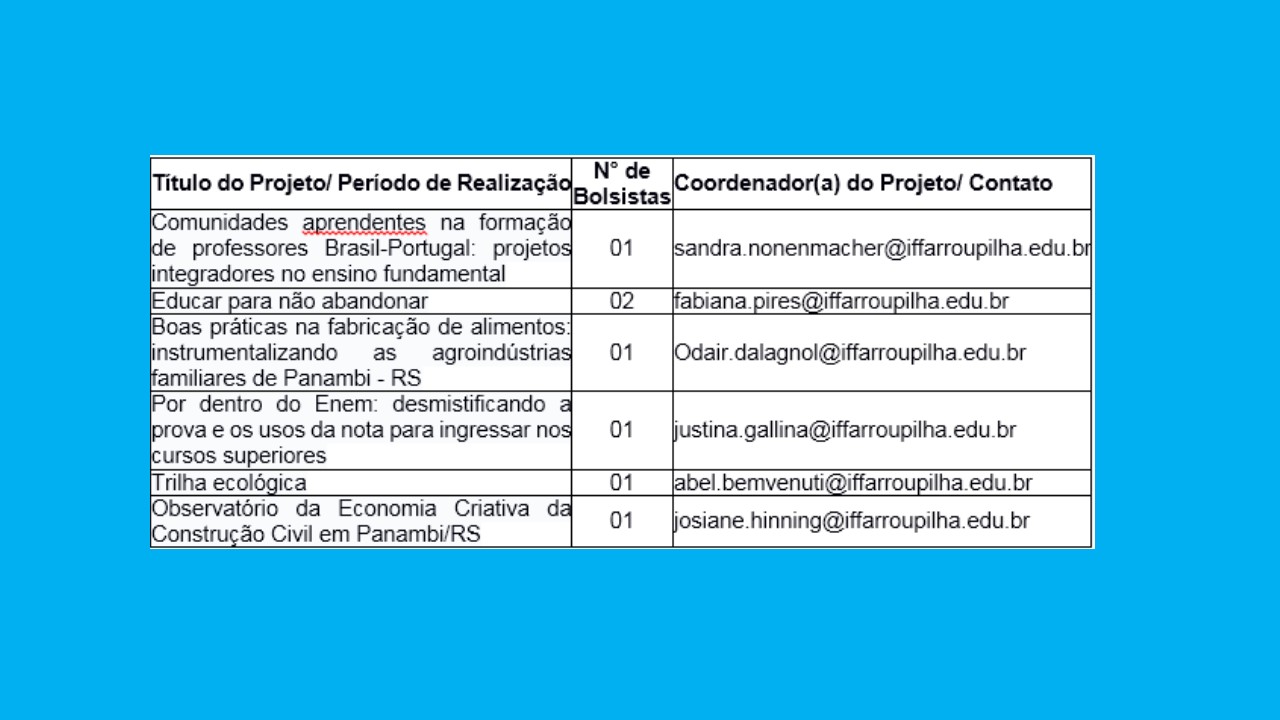 A Direção de Pesquisa, Extensão e Produção do IFFar – Campus Panambi disponibiliza sete bolsas para alunos/as interessados/as em atuar em seis diferentes projetos de extensão ofertados por servidores/as do IFFar – Campus Panambi. Há vagas para discentes de cursos técnicos e superiores.