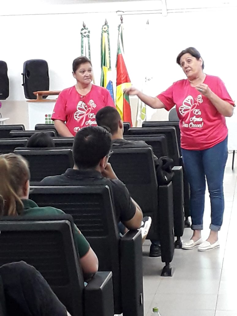 No turno da noite houve a participação das voluntárias da Liga Feminina de Combate ao Câncer de Panambi, as quais realizaram uma palestra com o título “Outubro Rosa: qual o meu compromisso com isso?”