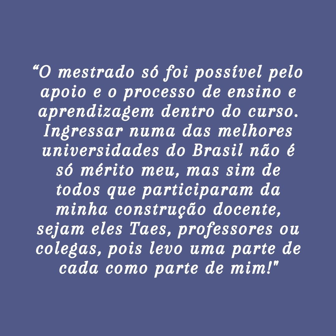 “O mestrado só foi possível pelo apoio e o processo de ensino e aprendizagem dentro do curso. Ingressar numa das melhores universidades do Brasil não é só mérito meu, mas sim de todos que participaram da minha construção docente, sejam eles Taes, professores ou colegas, pois levo uma parte de cada como parte de mim! Agradeço ao IFFar por tudo.”