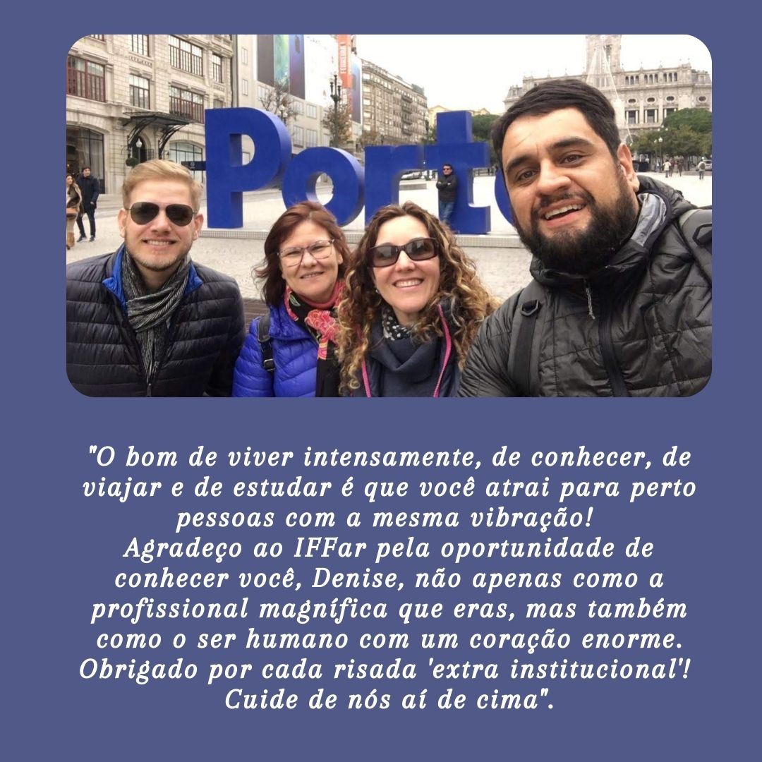 “Nós fomos para desenvolver parte da pesquisa do projeto “A Residência Pedagógica como elemento da Política Nacional de Formação de Professores” (2018-2019). Essa parte da investigação objetivou estudar as políticas de formação de professores em Portugal, visando trazer melhorias para os cursos de licenciatura ofertados no IFFar, com base no Instituto Politécnico da Guarda (IPG), consultando documentos referentes à legislação norteadora da Educação Básica e a formação de professores em Portugal.”
