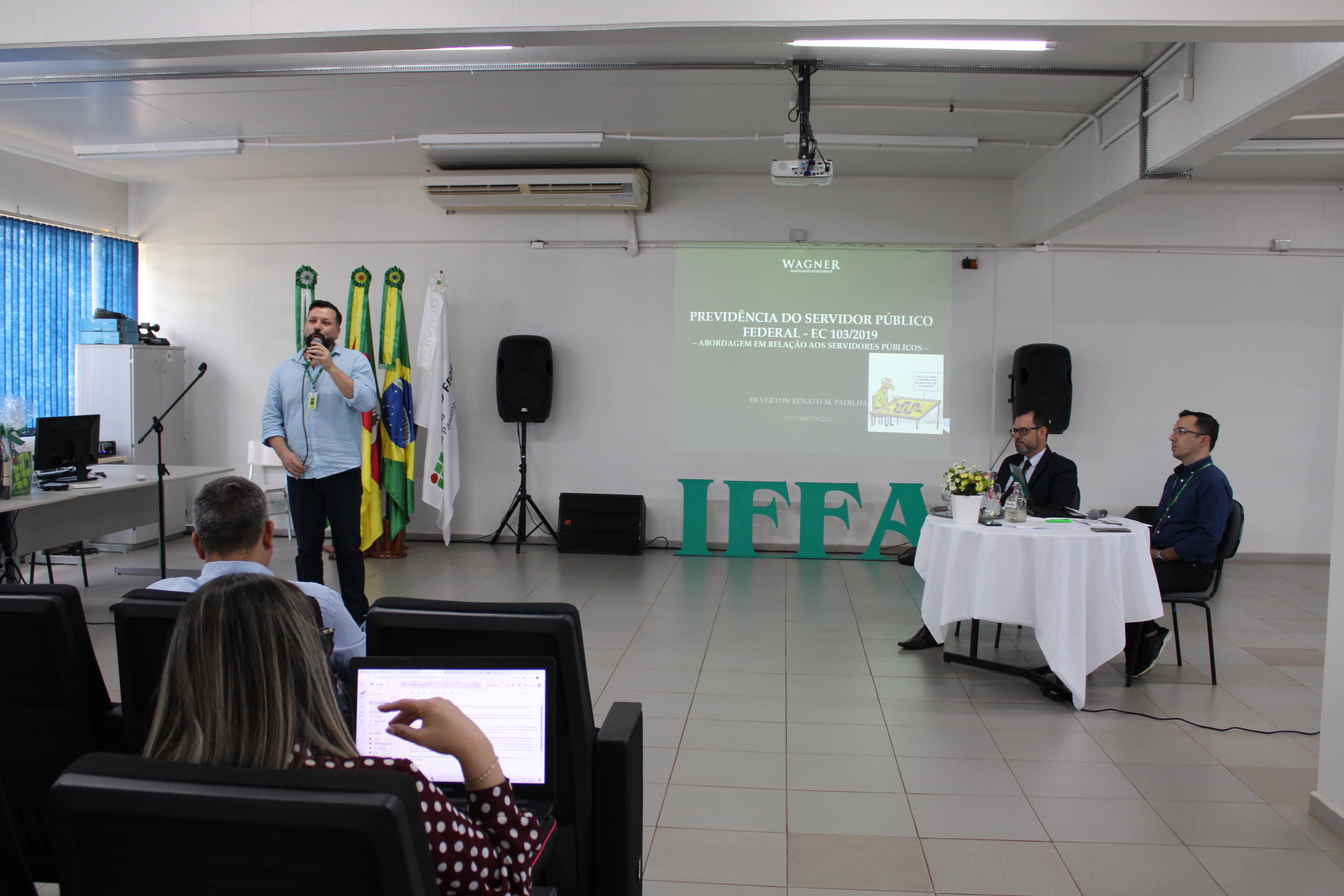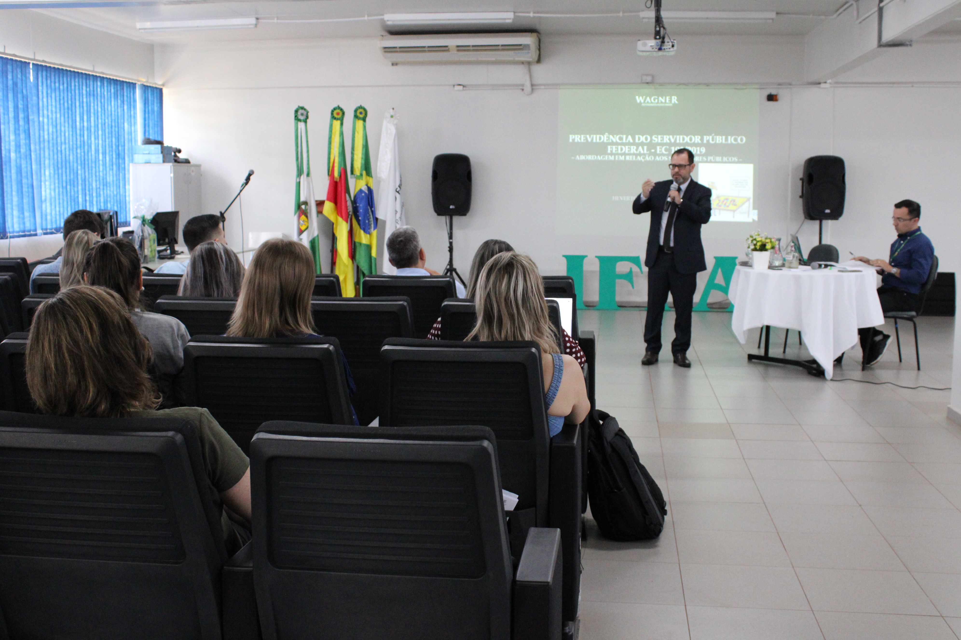 A palestra teve mediação do Sr. Jesner Nunes, servidor público lotado na Diretoria de Gestão de Pessoas da Reitoria do IFFar, vinculado ao Núcleo de Aposentadoria e Pensões.