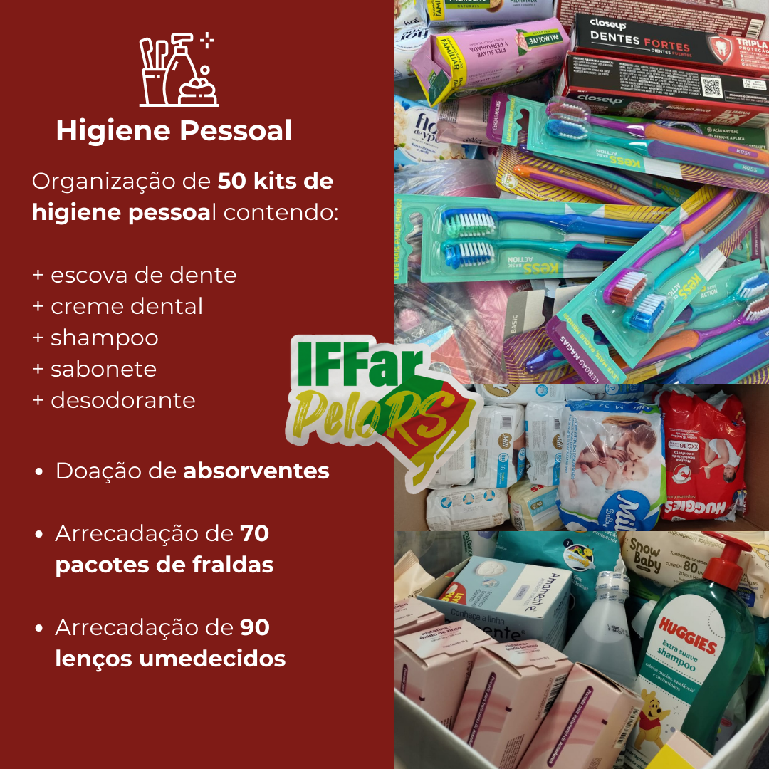 - Organização de 50 kits de higiene pessoal (escova de dente + creme dental + shampoo + sabonete + desodorante) + absorventes