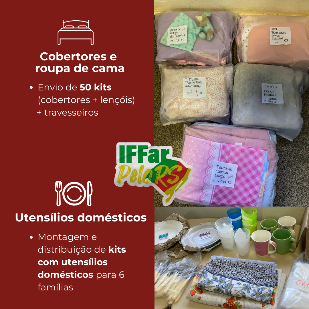- Montagem e distribuição de kits com utensílios domésticos para 6 famílias (pratos, talheres, copos, xícaras, potes, panos de prato, toalhas e alguns eletrodomésticos)