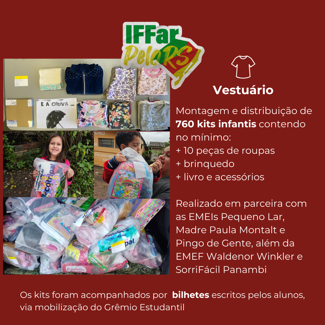 - Montagem e distribuição de 760 kits infantis (mínimo 10 peças de roupas + brinquedo + livro + acessórios), realizado em parceira com as EMEIs Pequeno Lar, Madre Paula Montalt e Pingo de Gente, além da EMEF Waldenor Winkler