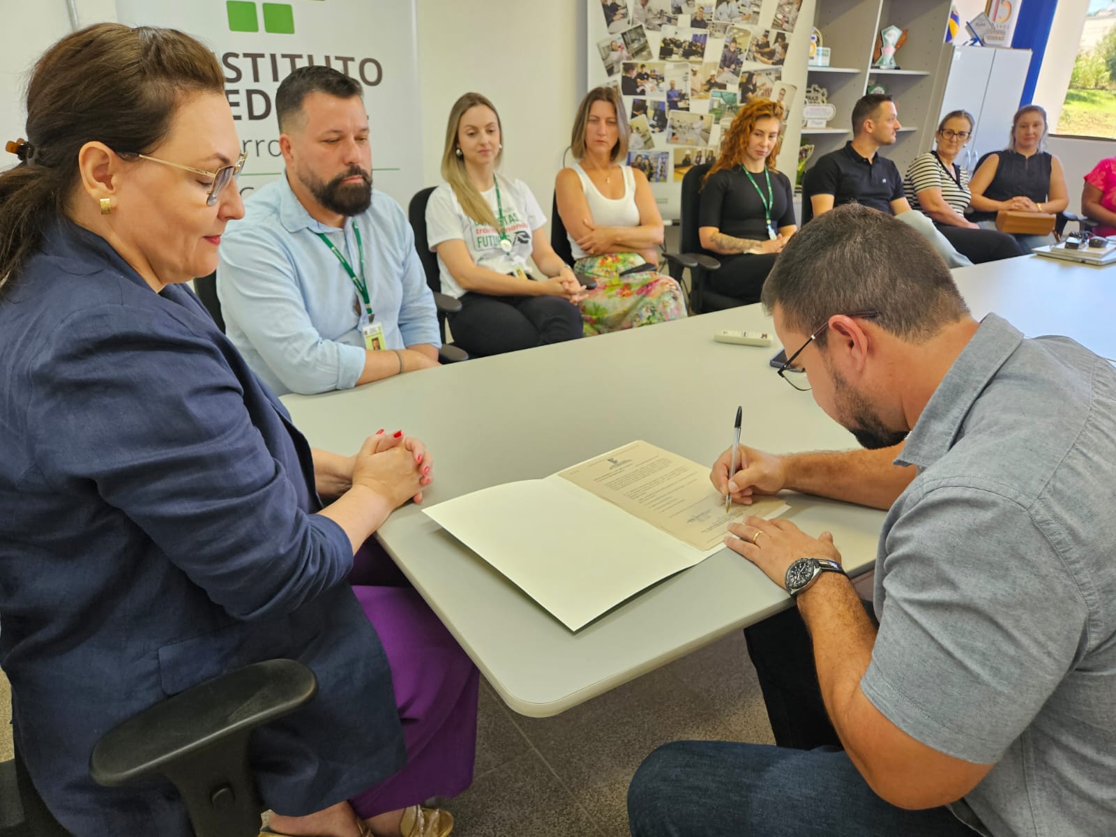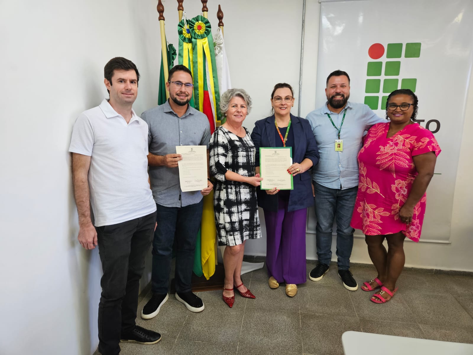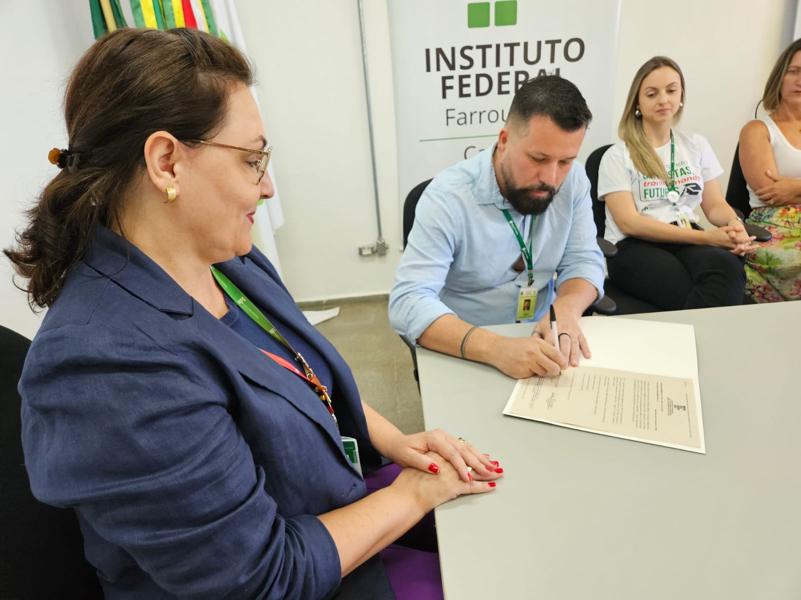 A cerimônia de assinatura, realizada no campus, contou com a presença da reitora do IFFar, professora Nídia Heringer; do diretor-geral do Campus Panambi, professor Jorge Alberto Lago Fonseca; do diretor-geral eleito, professor Marcelo Bataglin; da arquiteta do IFFar, Fabíola Machado; além de servidores do campus e de representantes da empresa contratada para a execução da obra.