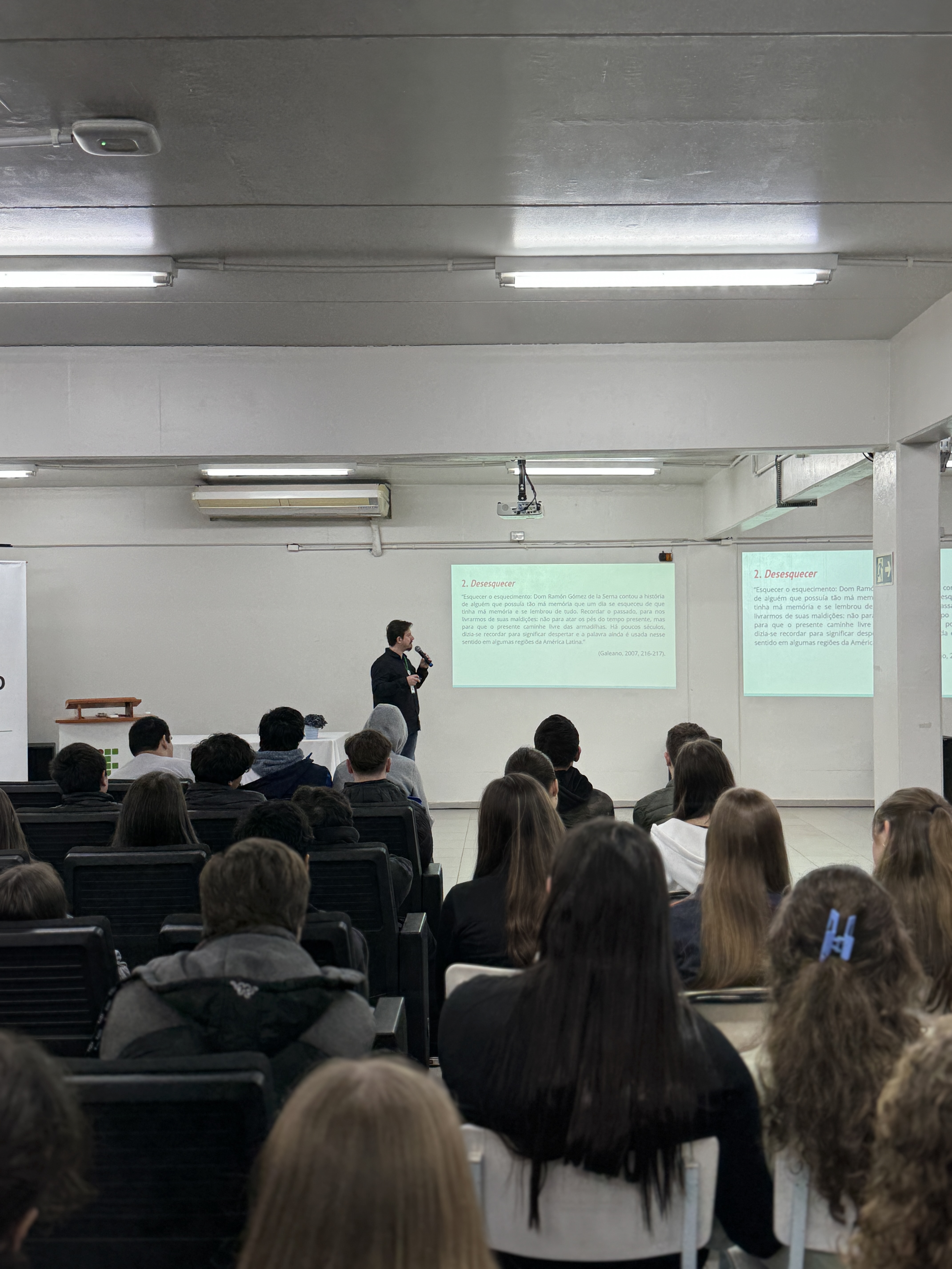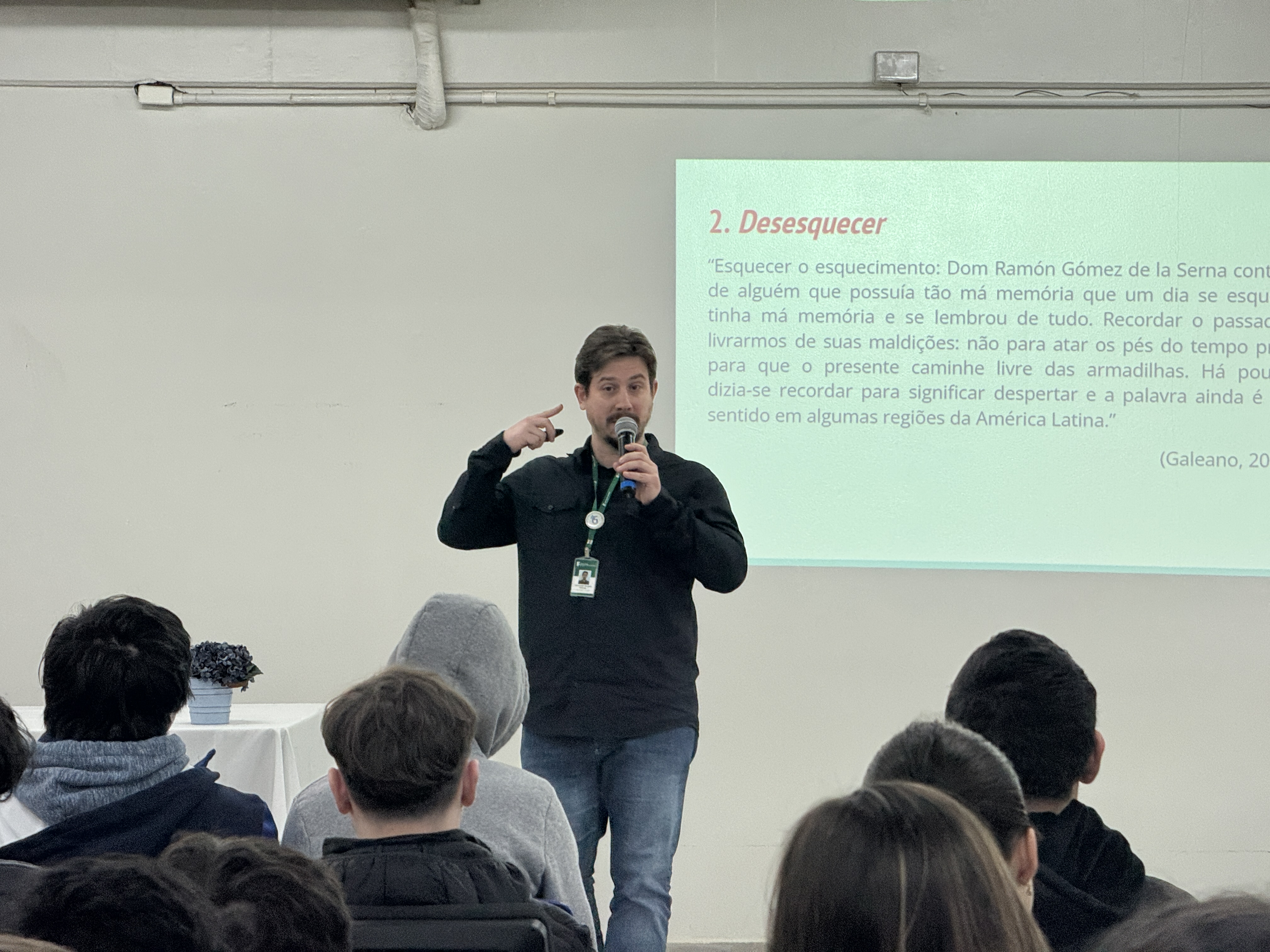 Na manhã de ontem (20/08), o Professor de História Dr. Gian Ruschel ministrou a palestra “O desesquecer como prática em defesa da democracia", pautando a prática de manter a história viva através da análise e discussão, em favor da liberdade coletiva.