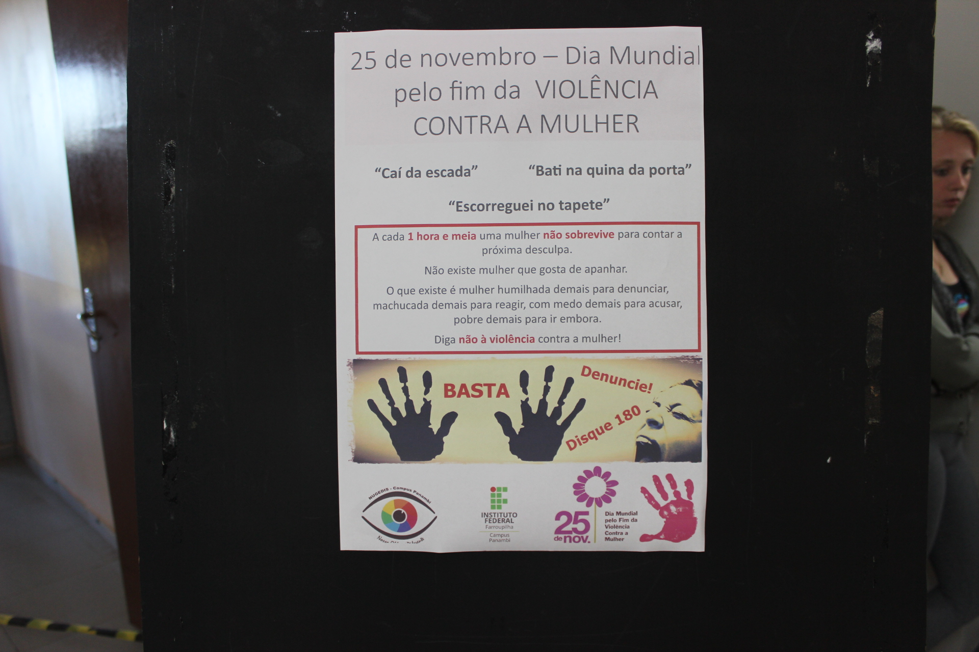 Na manhã do dia 27/11, integrantes do Núcleo de Gênero e Diversidade Sexual (NUGEDIS) do IFFar – Campus Panambi, promoveram uma atividade de sensibilização com os estudantes do ensino médio sobre o Dia da não Violência contra a mulher, comemorado internacionalmente em 25/11. Na atividade realizou-se uma instalação no corredor do campus e, durante o intervalo, vários dados sobre situações de violência contra a mulher foram abordados pelas integrantes do NUGEDIS.
