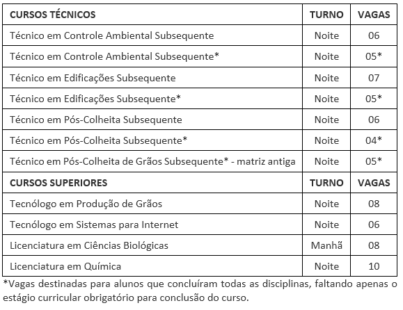 As inscrições devem ser realizadas na Coordenação de Registros Acadêmicos, presencialmente, ou via encaminhamento da documentação solicitada por carta registrada – a qual deve chegar ao campus até dia 22 de junho. Informações adicionais podem ser obtidas no Edital 282/2018, no site www.iffarroupilha.edu.br/editais ou pelo telefone (55) 3376 8818. Confira anexo o número de vagas em cada curso.