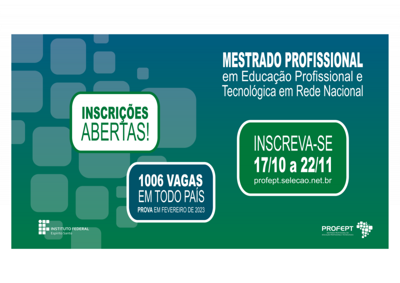 O Mestrado Profissional em Educação Profissional e Tecnológica (ProfEPT) está ofertando 1.006 vagas para todo o Brasil, para iniciar o curso em 2023. O edital do processo seletivo já está publicado, e as inscrições começam no dia 17 de outubro e vão até 22 de novembro deste ano. A seleção será feita por meio do Exame Nacional de Acesso (ENA), marcado para fevereiro de 2023.