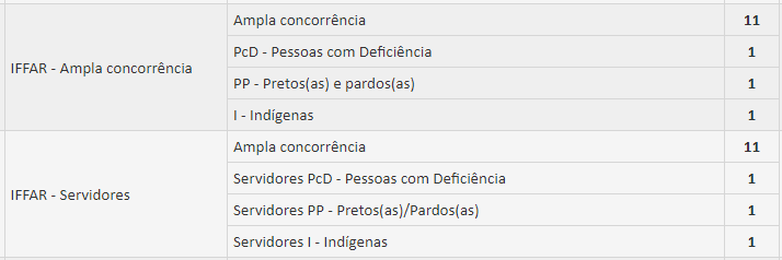 O IFFar oferta 28 vagas, distribuídas conforme a tabela abaixo:
