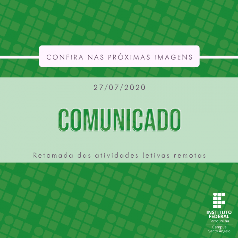 O Instituto Federal Farroupilha Campus Santo Ângelo comunica a comunidade acadêmica que conforme deliberação do CONSUP retomaremos o calendário letivo no dia 03 de agosto de 2020 e devido a questões de prevenção essa retomada será de maneira remota.