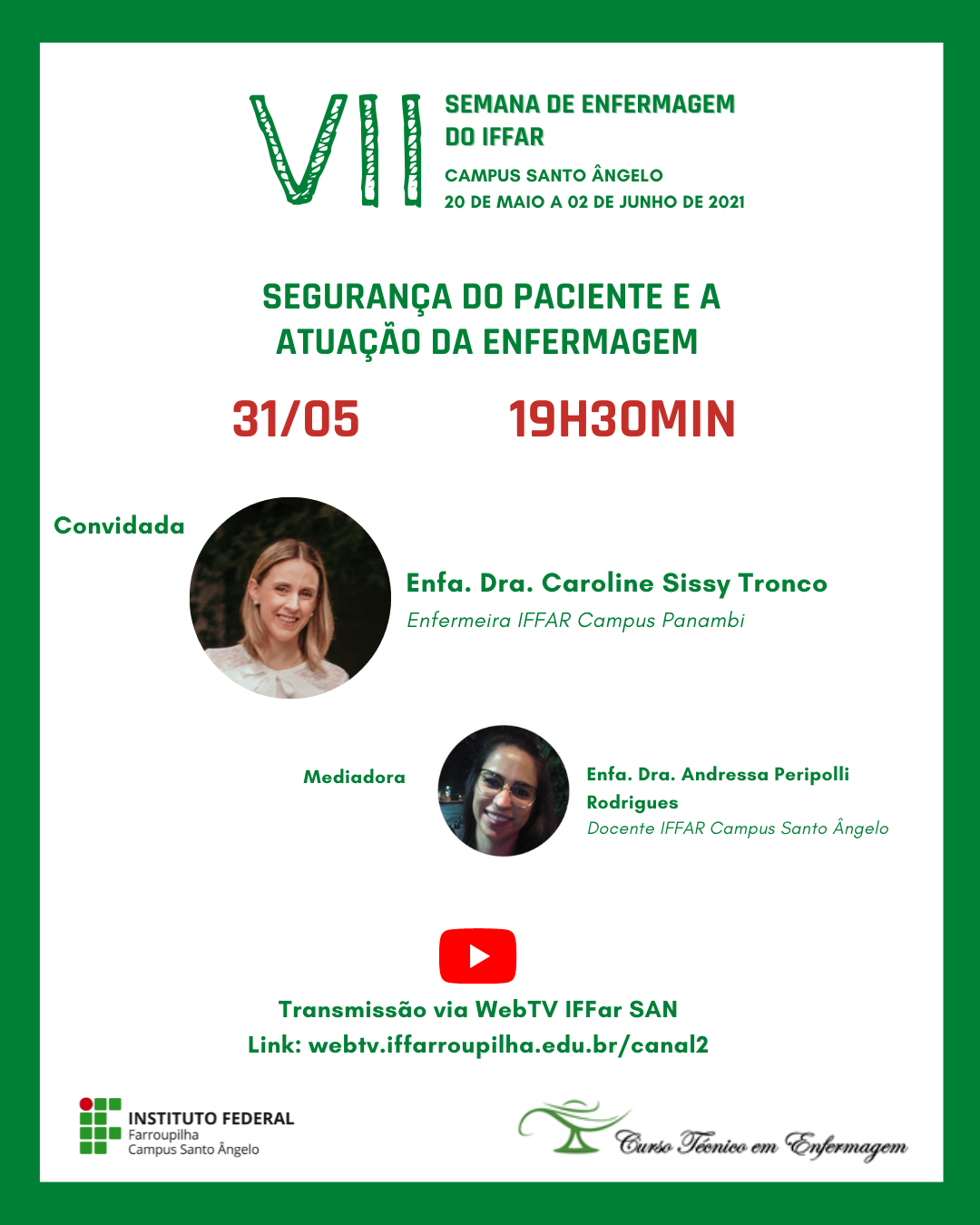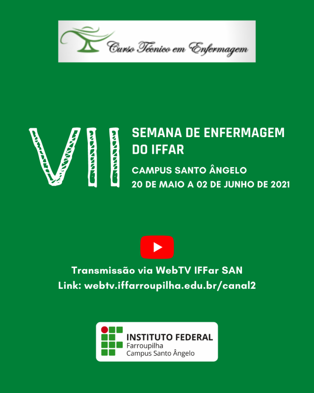 A VII Semana de Enfermagem do IFFAR, a ser realizada dos dias 20 de maio a 02 de junho de 2021, foi pensada com o intuito de proporcionar um importante momento de reflexão e aprendizado sobre o cuidado ao ser humano.