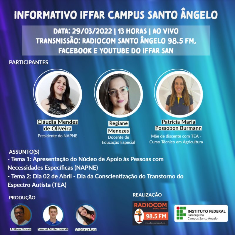 Nesta terça-feira (29/03/2022) às 13h, acompanhe AO VIVO o Informativo do IFFar SAN no seu rádio (98.5 FM), celular ou computador, através da RADIOCOM Santo Ângelo e das redes do Campus.