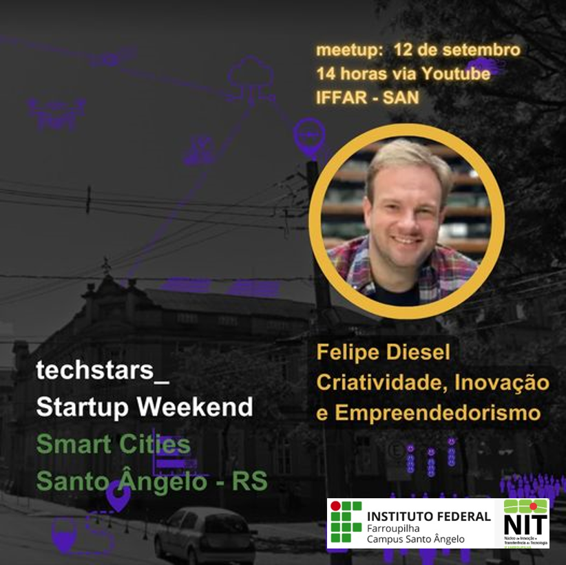 O IFFAR Campus Santo Ângelo, por meio do NIT (Núcleo de Inovação e Transferência de Tecnologia) estará promovendo no dia 12 de setembro o MeetUp com o tema “Criatividade, Inovação e Empreendedorismo” com Felipe Diesel, educador, empresário e CEO da Yours Bank.