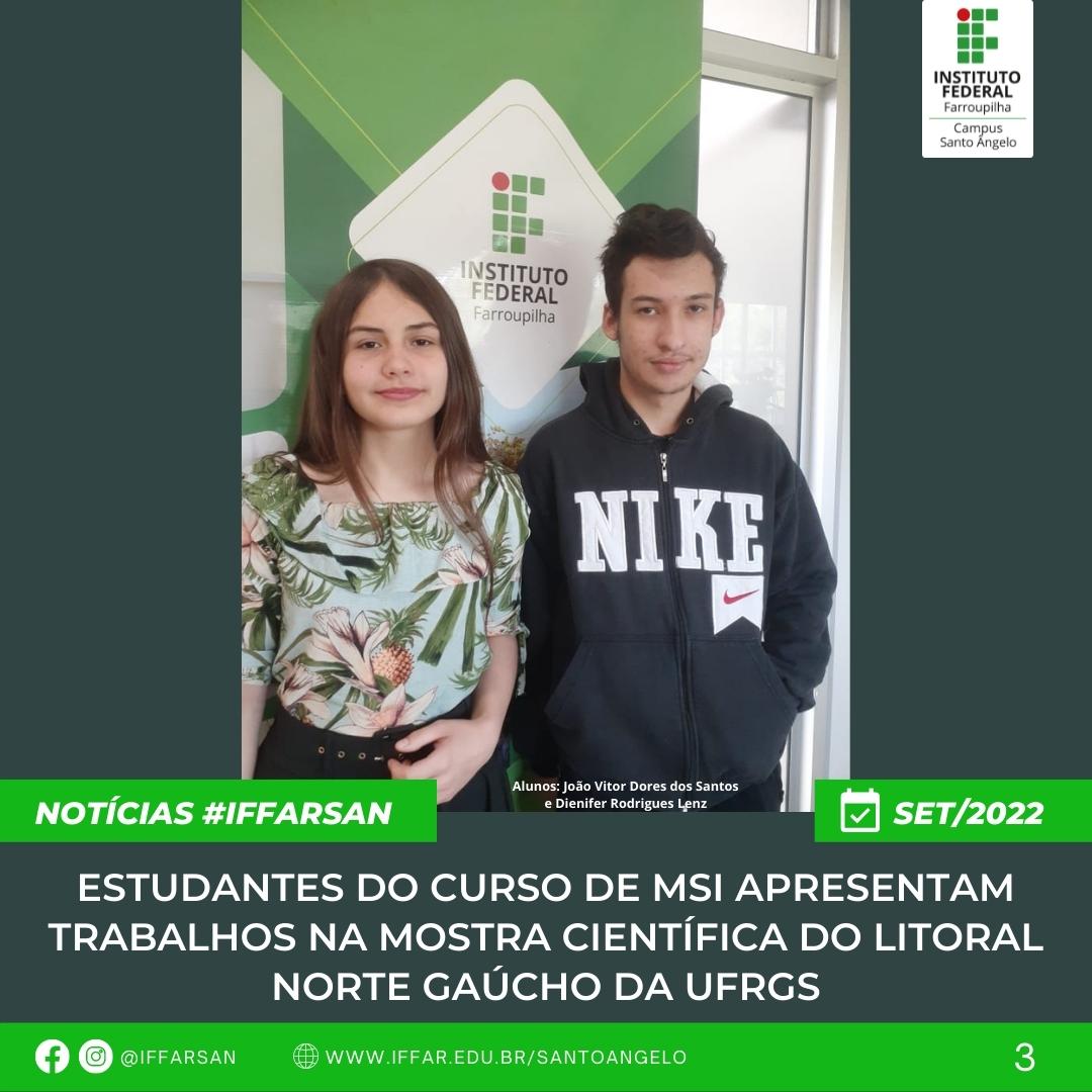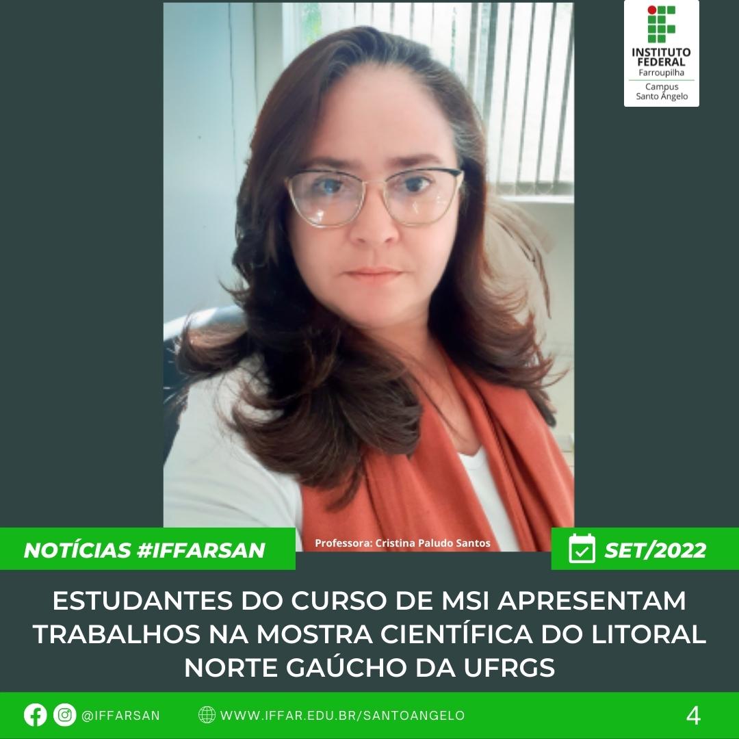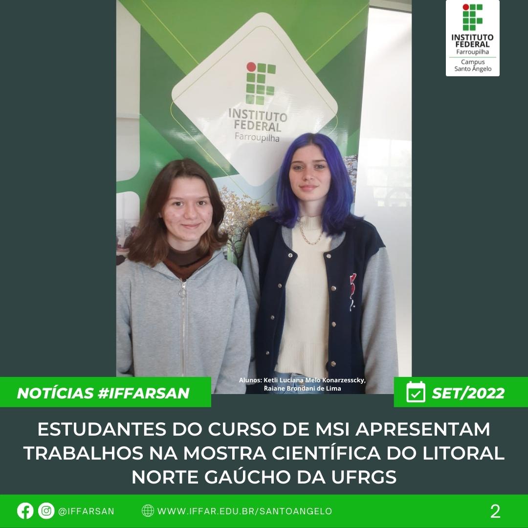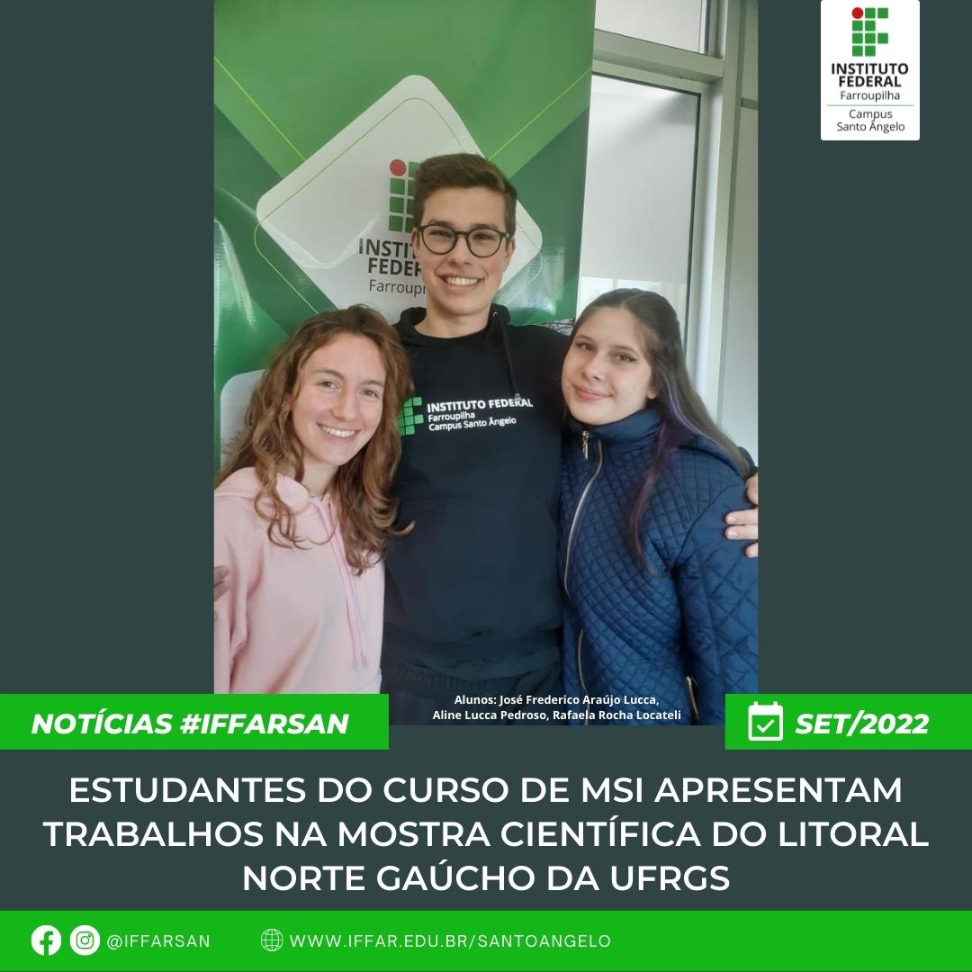 Os trabalhos de 3 GTs compostos pelos alunos José Frederico Araújo Lucca, Aline Lucca Pedroso, Rafaela Rocha Locateli, Ketli Luciana Melo Konarzesscky, Raiane Brondani de Lima, João Vitor Dores dos Santos e Dienifer Rodrigues Lenz foram submetidos, aprovados e apresentados no dia 15 de setembro na Mostra Cientifica da UFRGS.