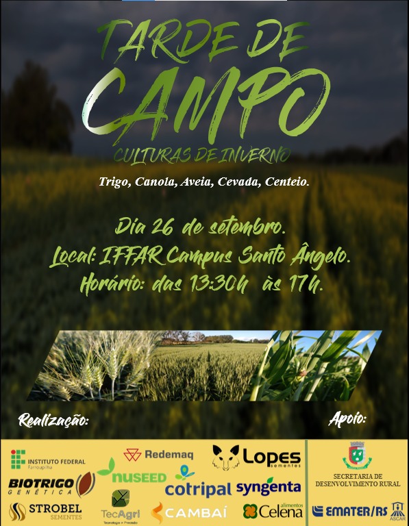 O IFFar Campus Santo Ângelo e parceiros, promovem a I Tarde de Campo de Culturas de Inverno, que ocorrerá no dia 26/09 às 13:30h, na área experimental do Campus.
