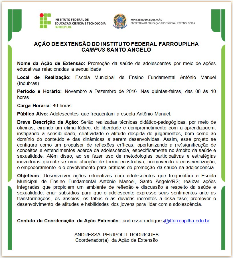 Objetivos: Desenvolver ações educativas com adolescentes que frequentam a Escola Municipal de Ensino Fundamental Antônio Manoel, Santo Ângelo/RS; realizar ações integradas que propiciem um ambiente de reflexão e discussão a respeito da saúde e sexualidade; criar subsídios para que o adolescente expresse seus sentimentos ante as transformações, os anseios, os tabus e as dúvidas inerentes a essa fase; promover o desenvolvimento de atitudes e habilidades dos jovens para lidar com a adolescência.